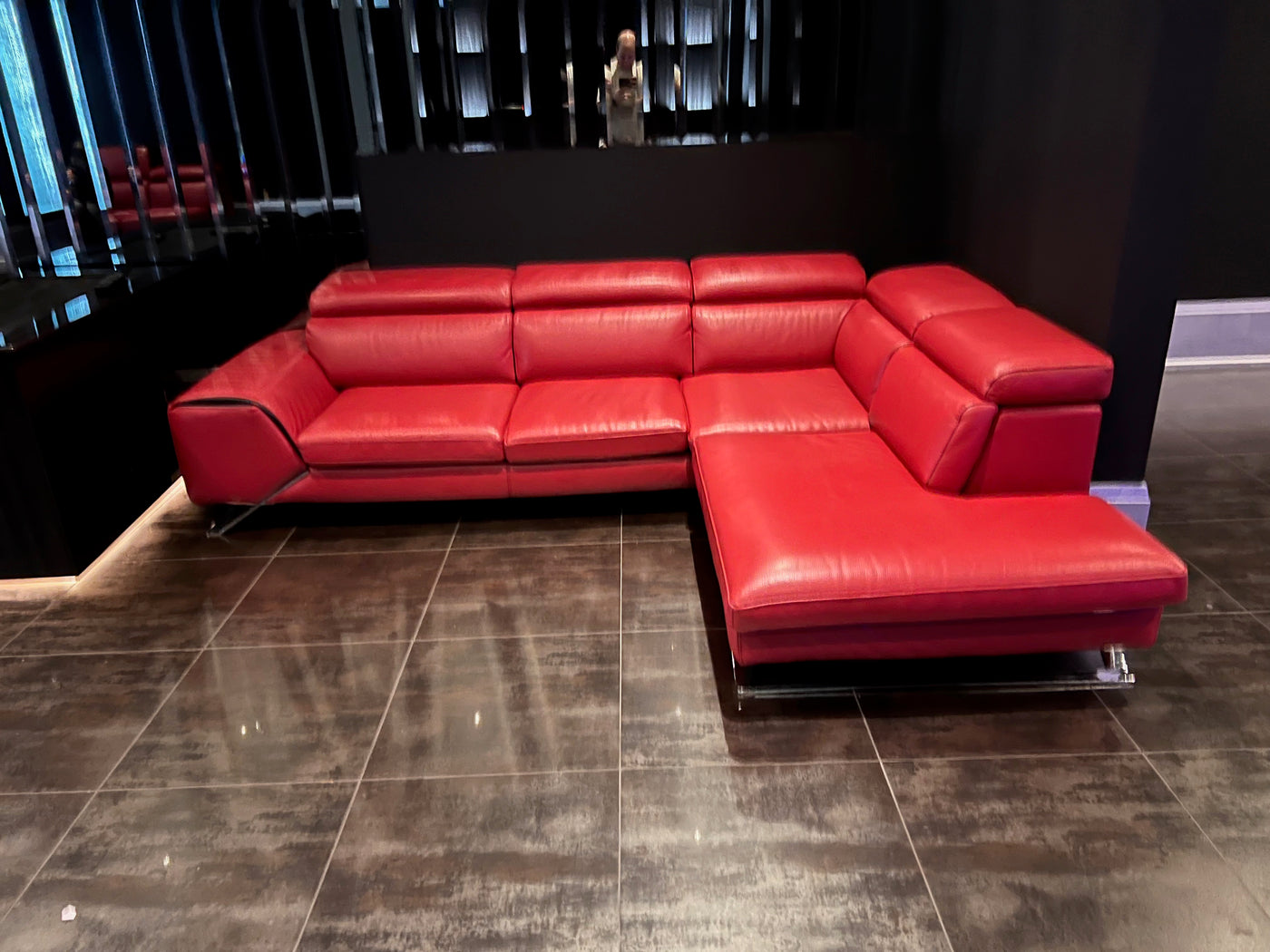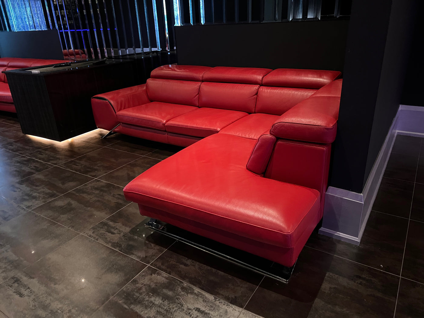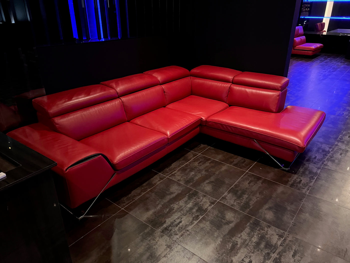 Red Leather Sectional Sofa, Right Facing. Head rests are adjustable-- can be flat as shown or tilted up on any angle.
