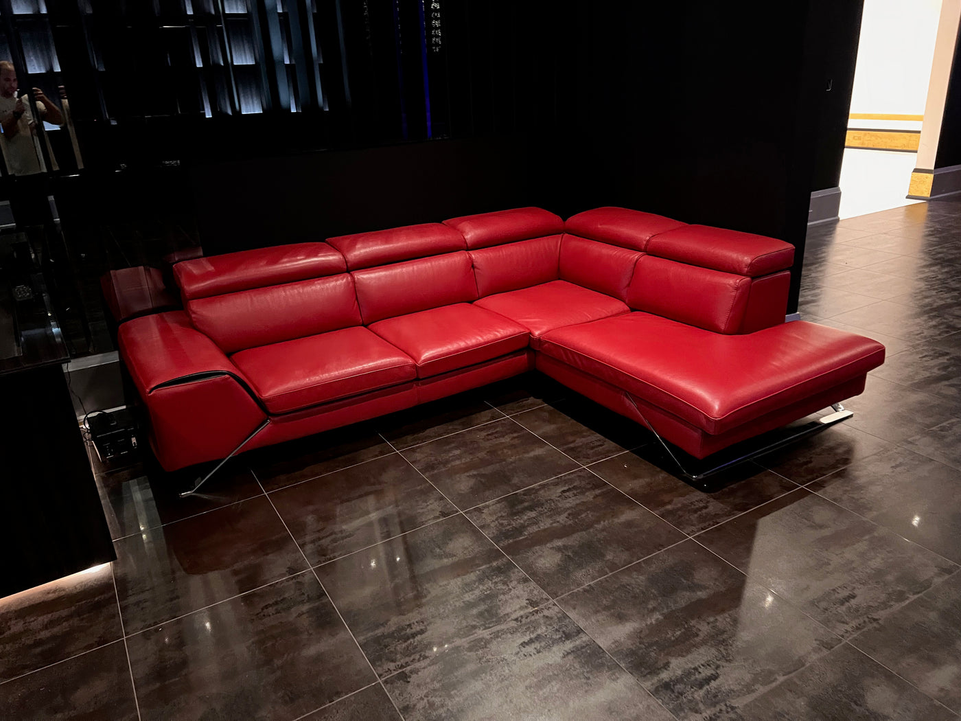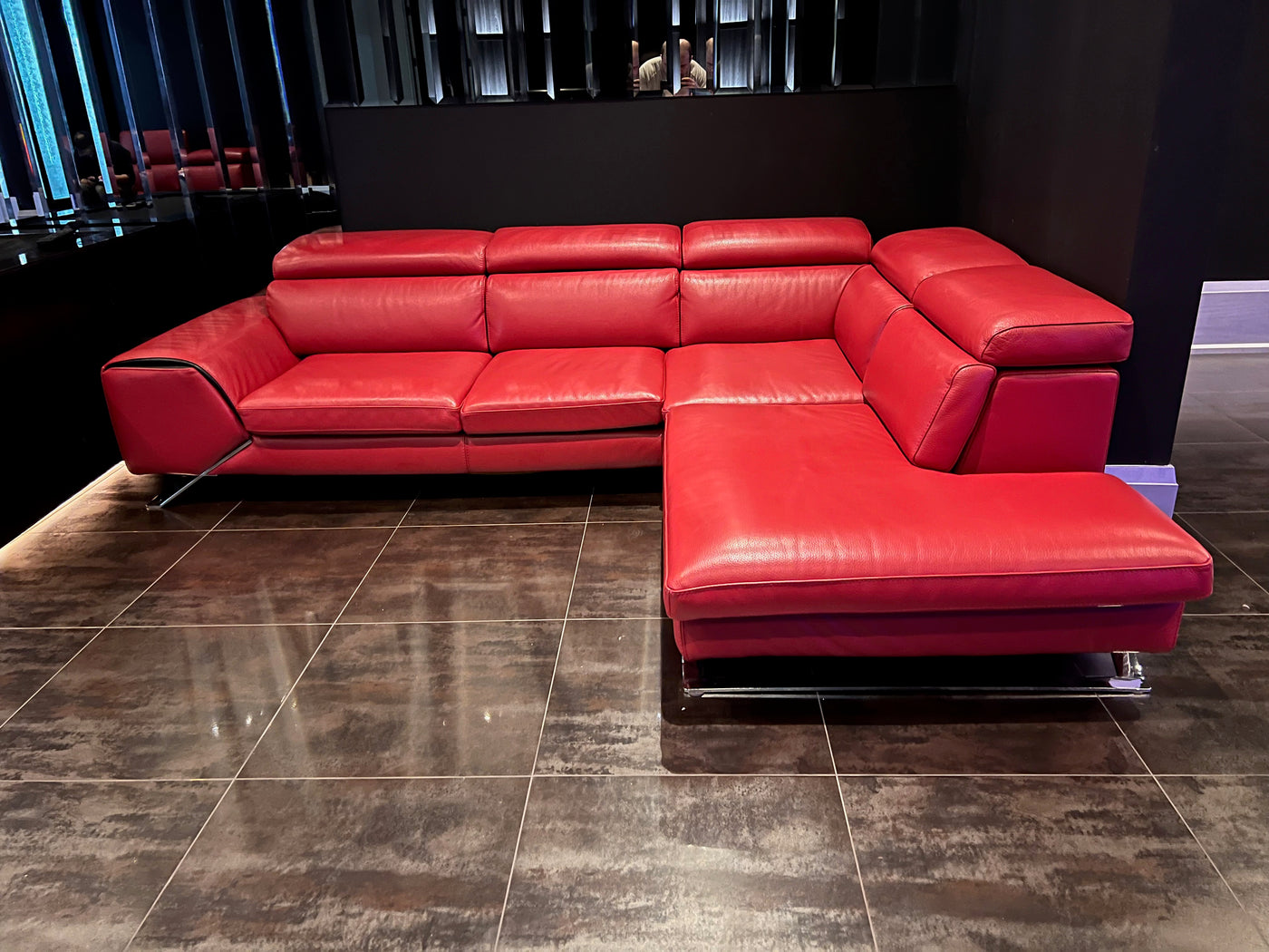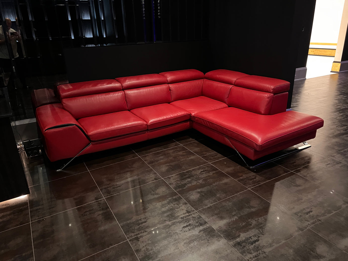 Red Leather Sectional Sofa, Right Facing. Head rests are adjustable-- can be flat as shown or tilted up on any angle.