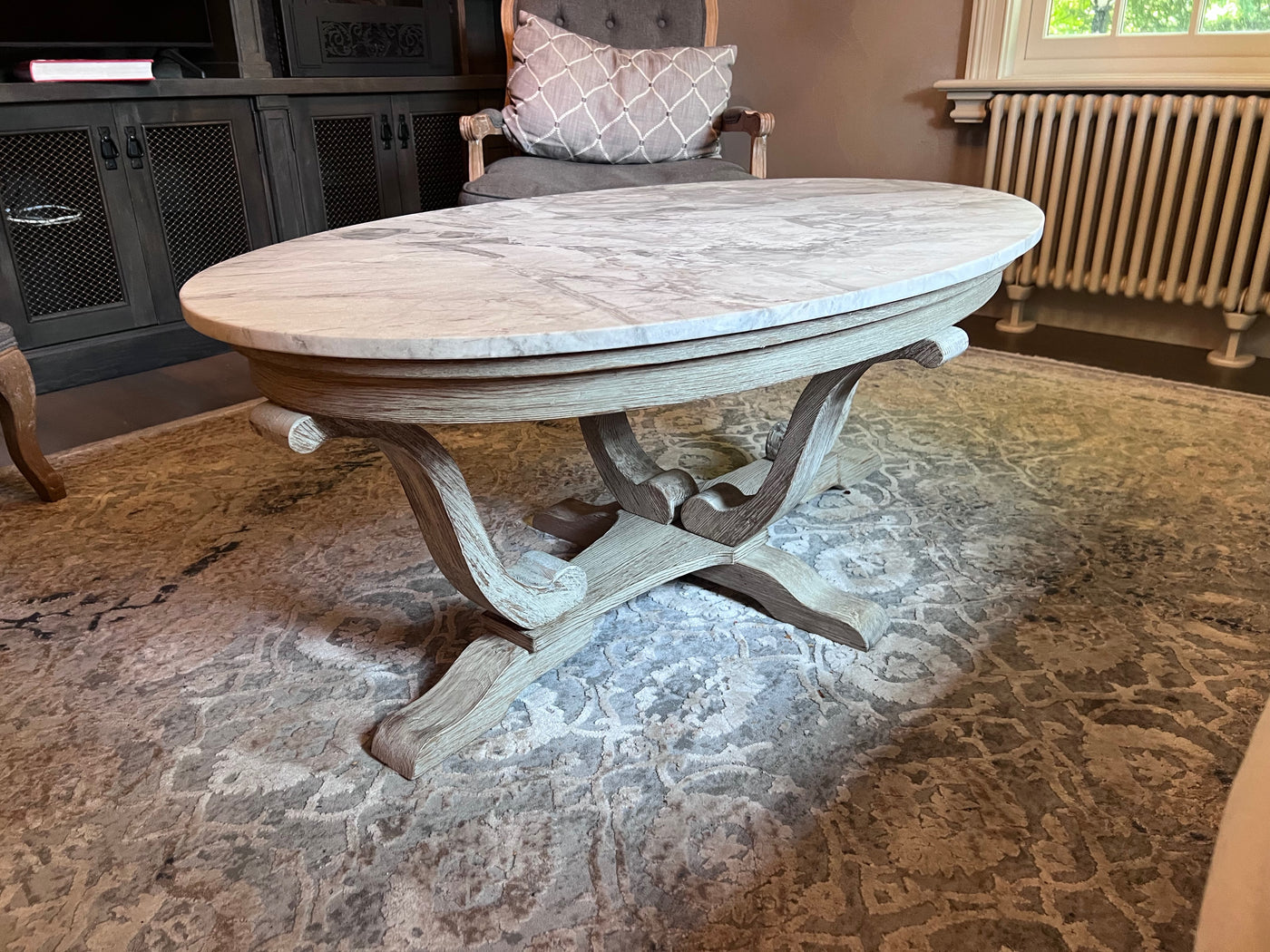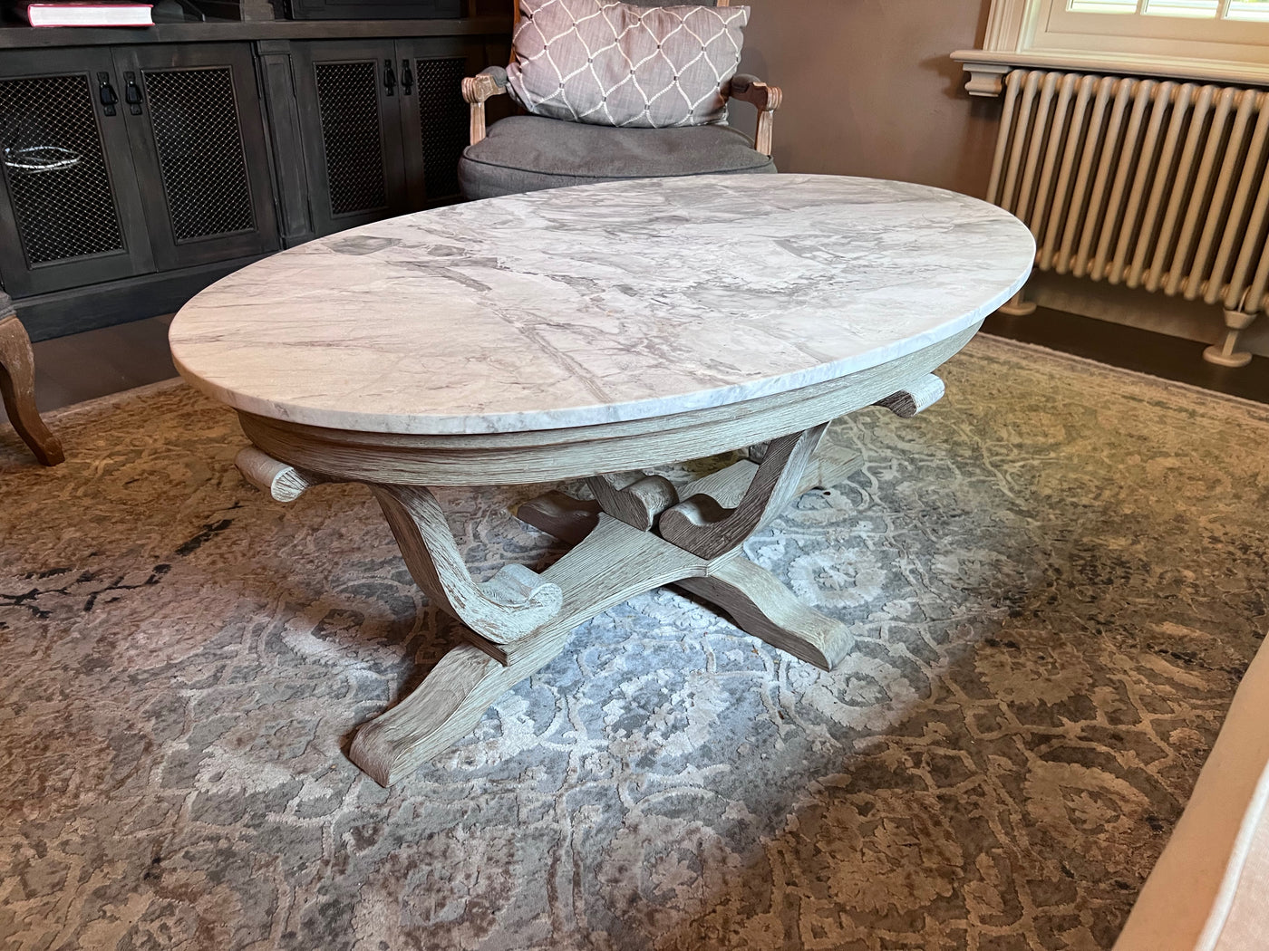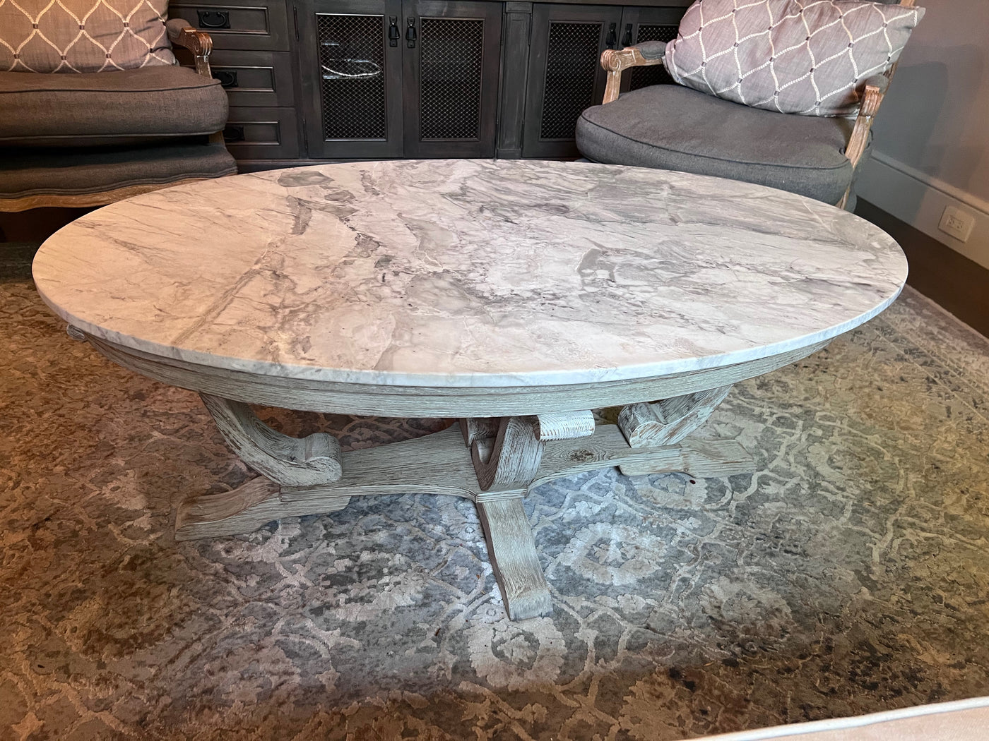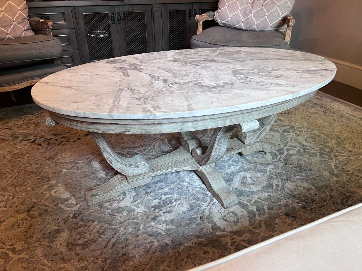 Liberty Furniture Greystone Mill Oval Cocktail Table with Custom Marble Top.