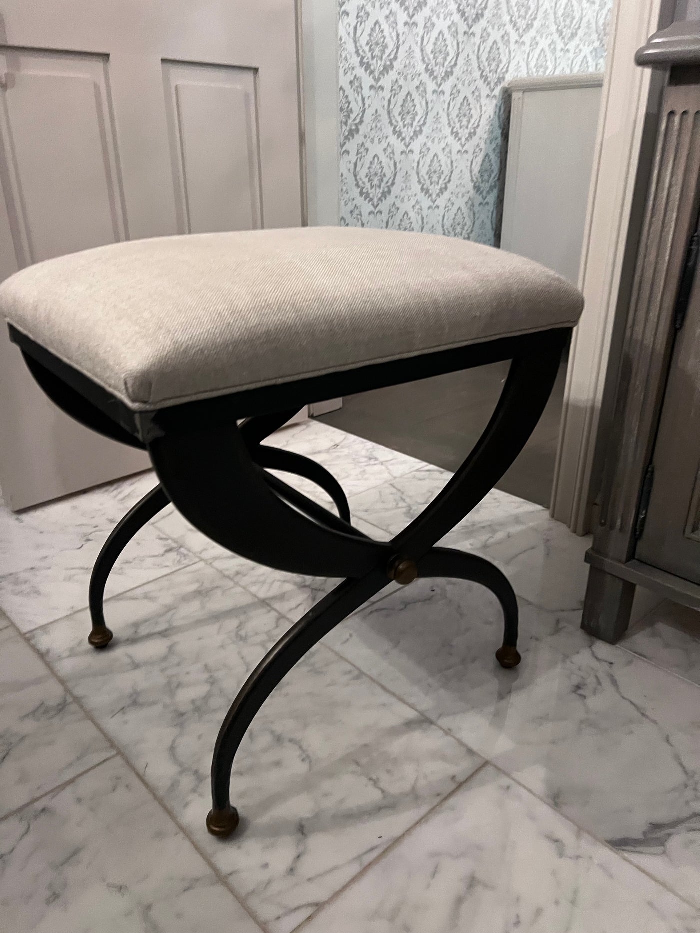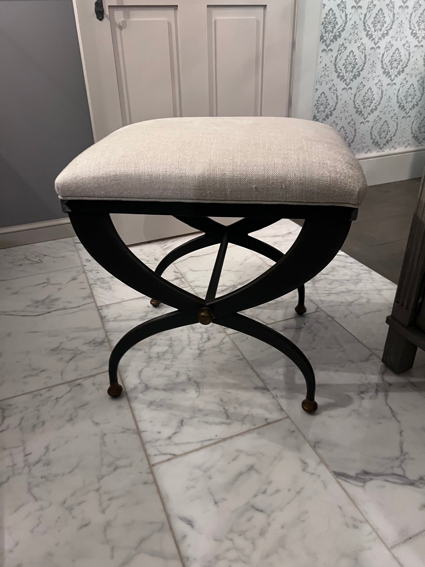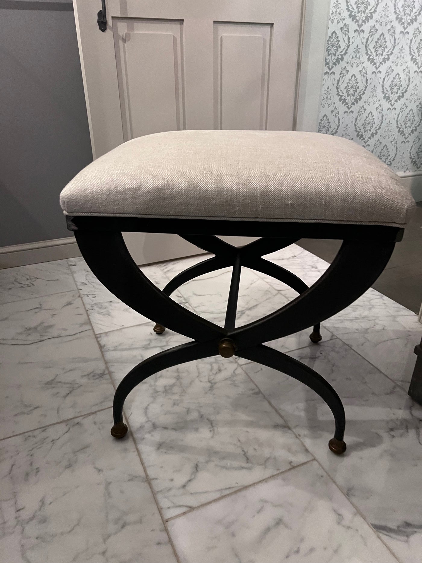 RESTORATION HARDWARE 19TH C. FRENCH S-CURVE LINEN STOOL.