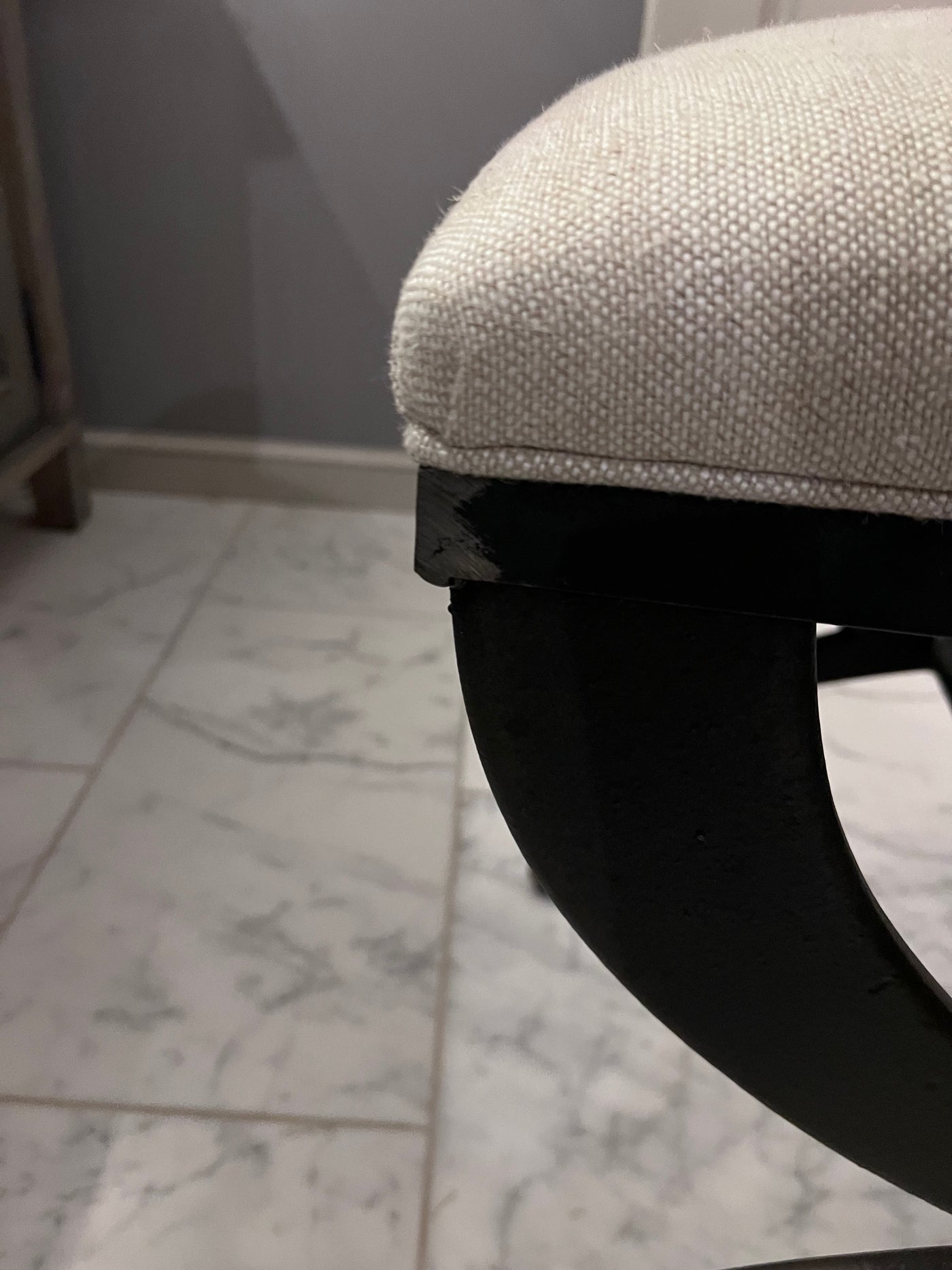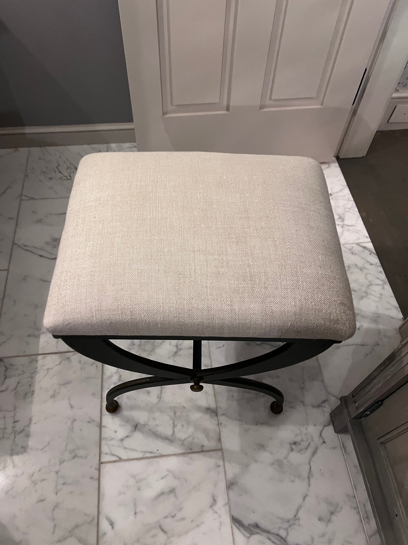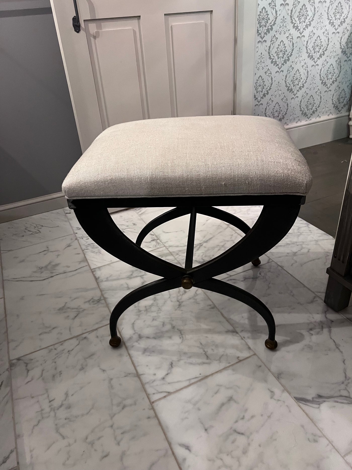 RESTORATION HARDWARE 19TH C. FRENCH S-CURVE LINEN STOOL.
