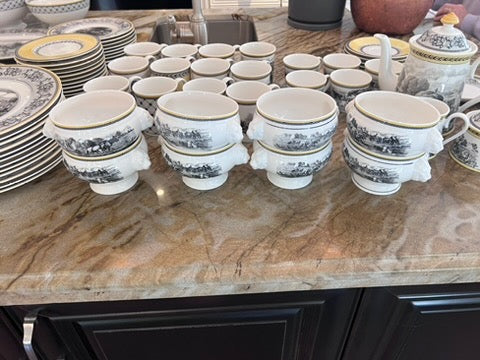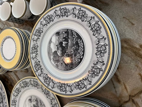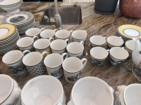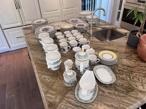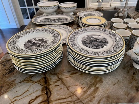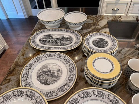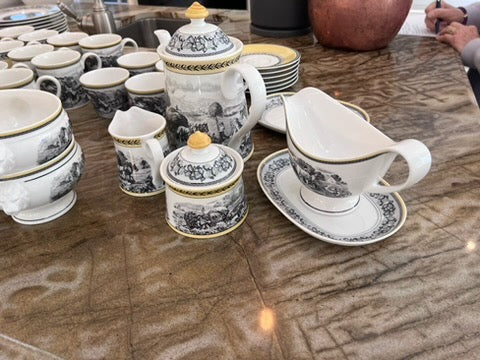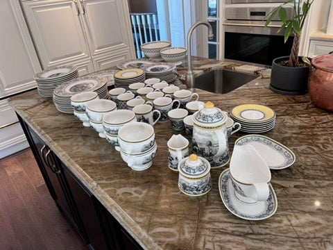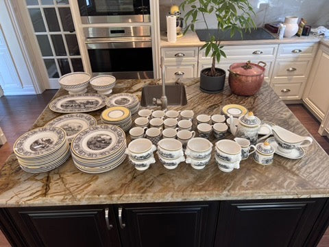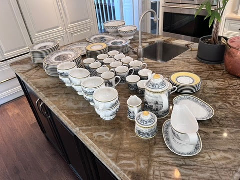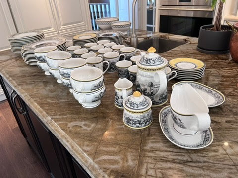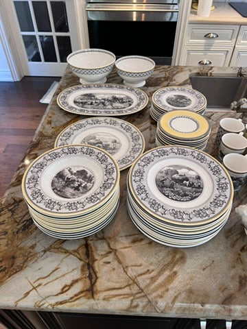 12 dinner plates9 salad plates12 bread & butter plates12 rim soup bowls12 mugs5 cups & saucers8 handles bowls16" plattercharger plate 12.5"2 serving bowlsgravy boat on standcoffee potcreamersugar