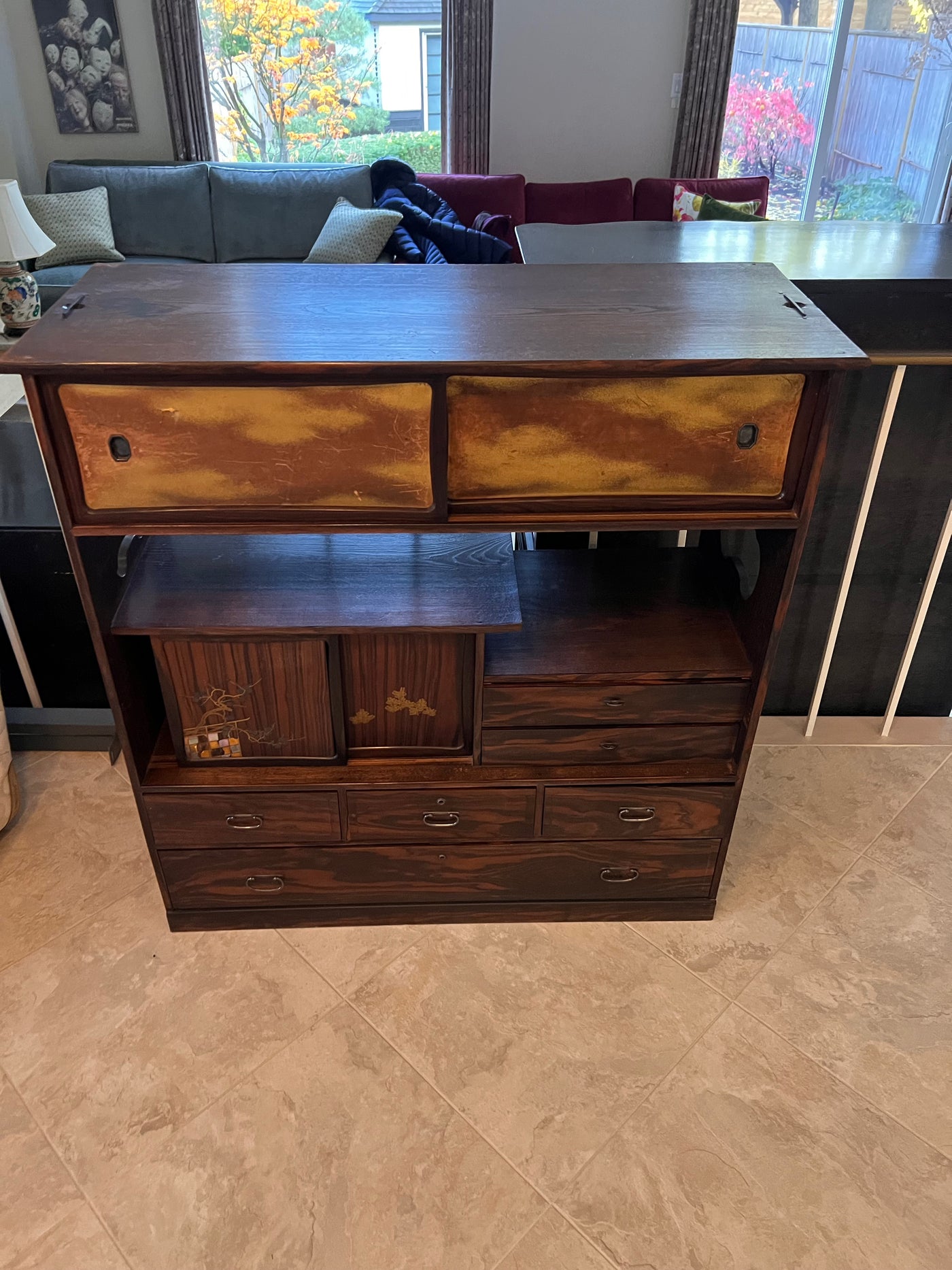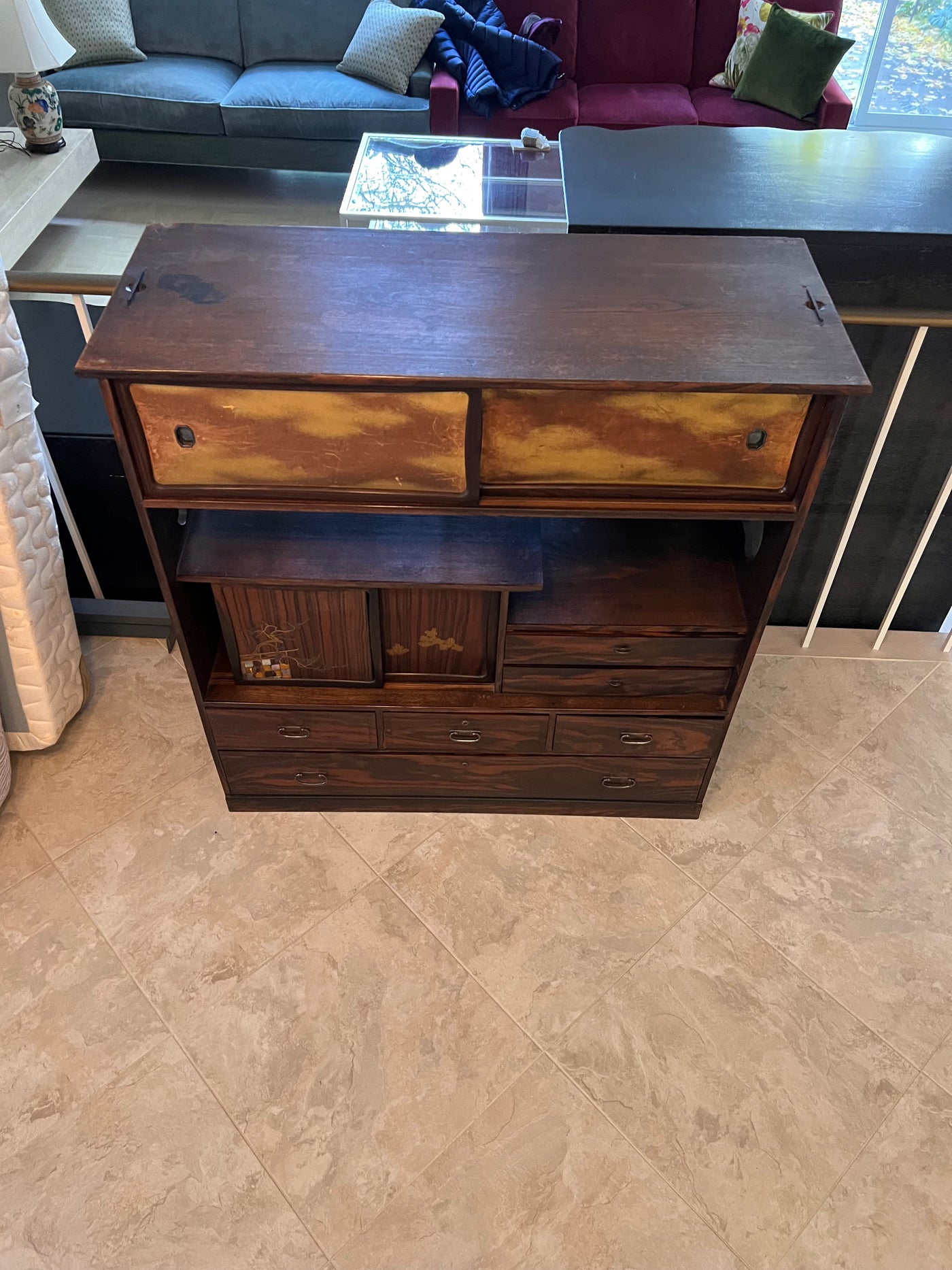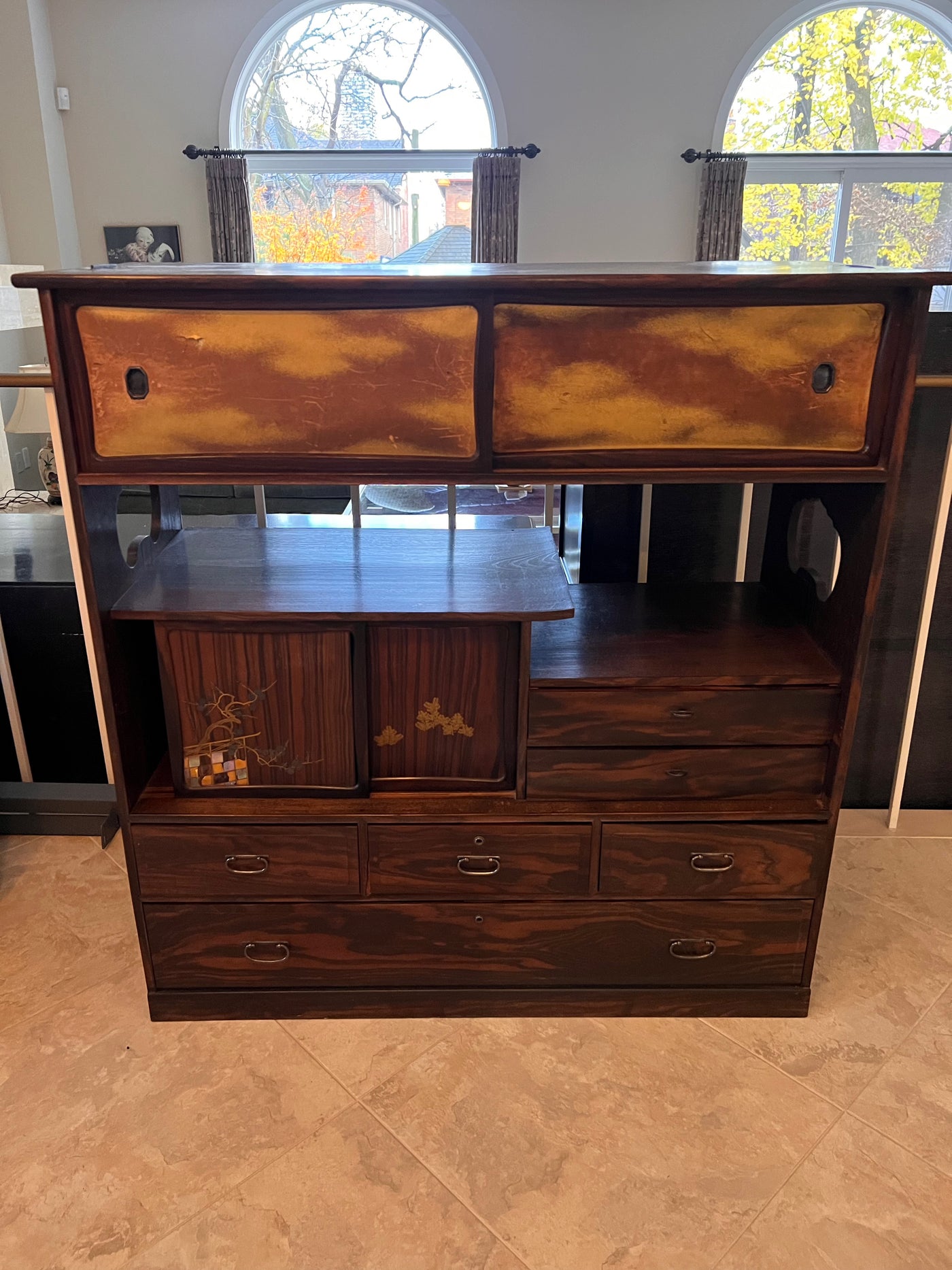 Antique Japanese Tea Cabinet. The top portion has 2 part that slide open. The middle left portion slides open, and the middle right has 2 drawers. Very unique piece brought back from Japan!