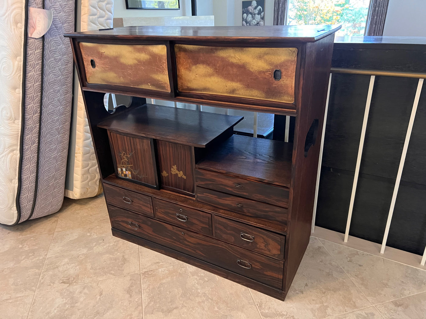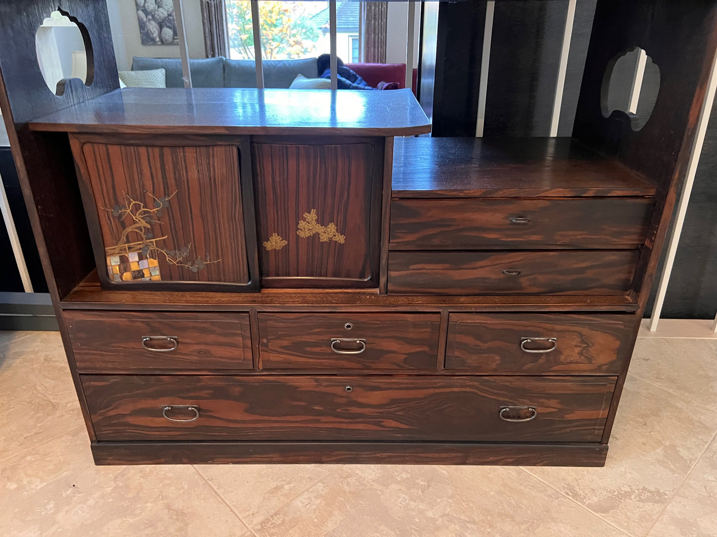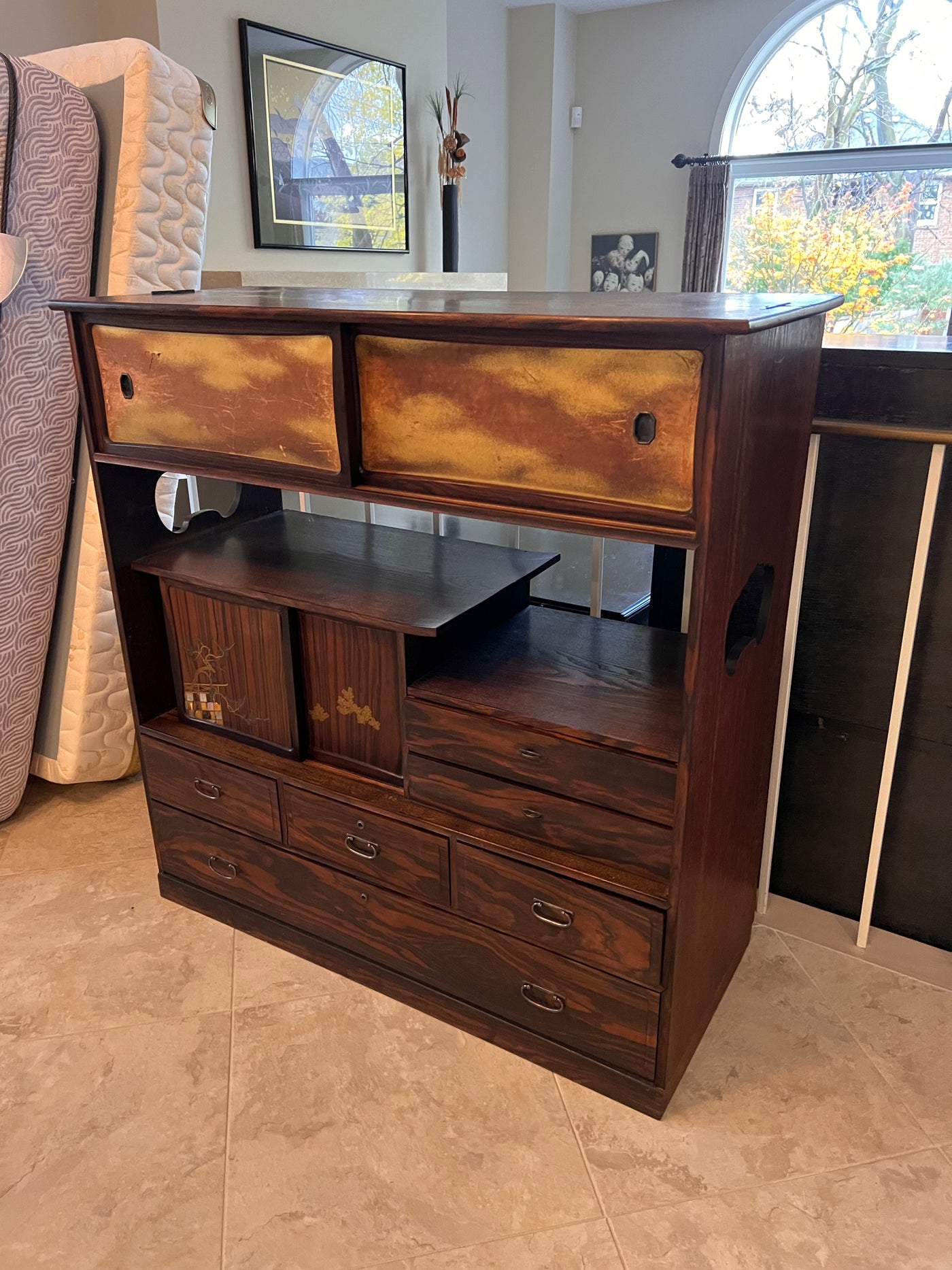 Antique Japanese Tea Cabinet. The top portion has 2 part that slide open. The middle left portion slides open, and the middle right has 2 drawers. Very unique piece brought back from Japan!