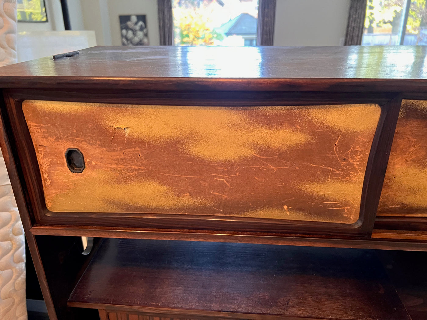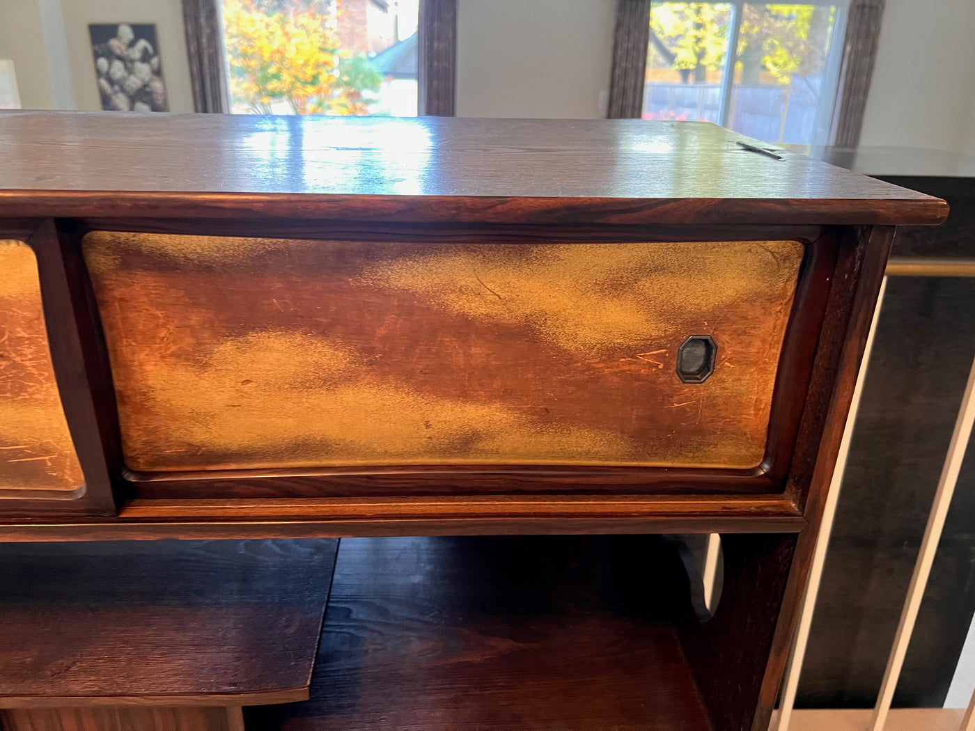 Condition: the top left cabinet sliding door has scratches and some wear on it as clearly shown in the pictures. The top right sliding door at times can fall off the track and needed to be reinforced. May also have the odd marks throughout consistent with age. Overall in good condition for being an Antique.