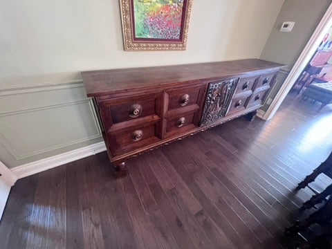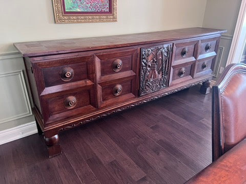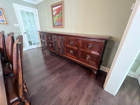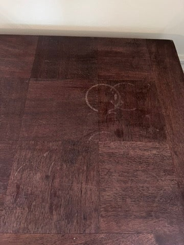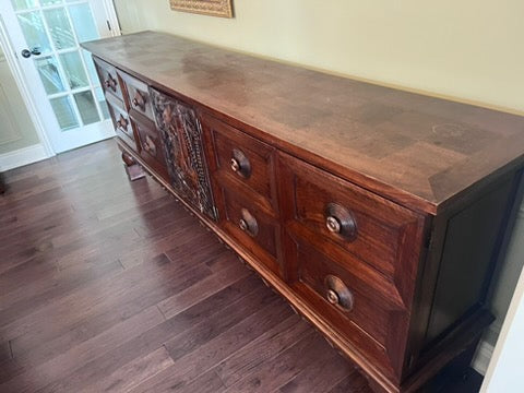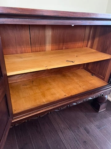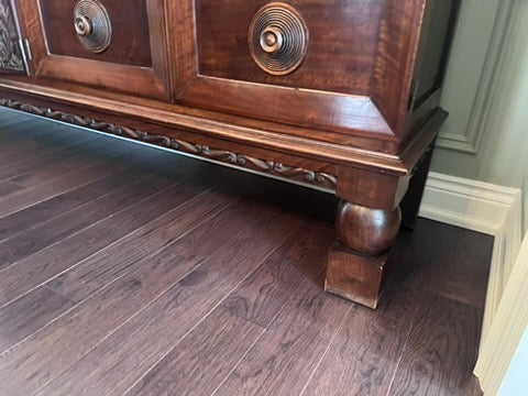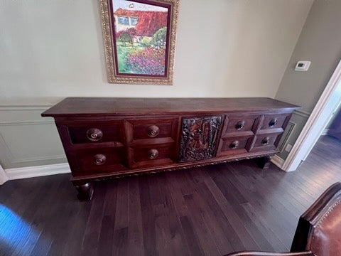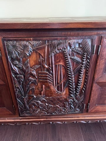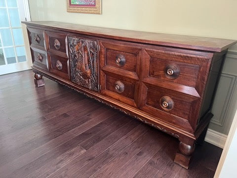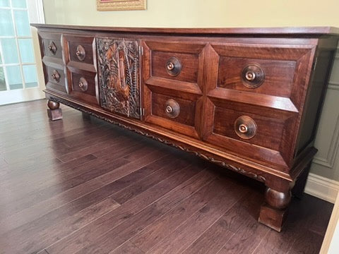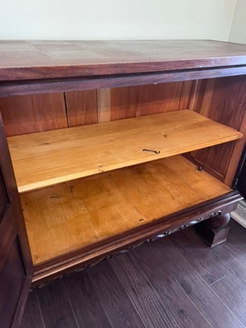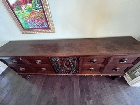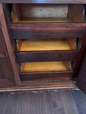 This is an early 1900's antique piece. As such there is some wear on discolouration on the top. As well, the centre part on the front has 2 cracks in the wood consistent with age. Does not affect the function.