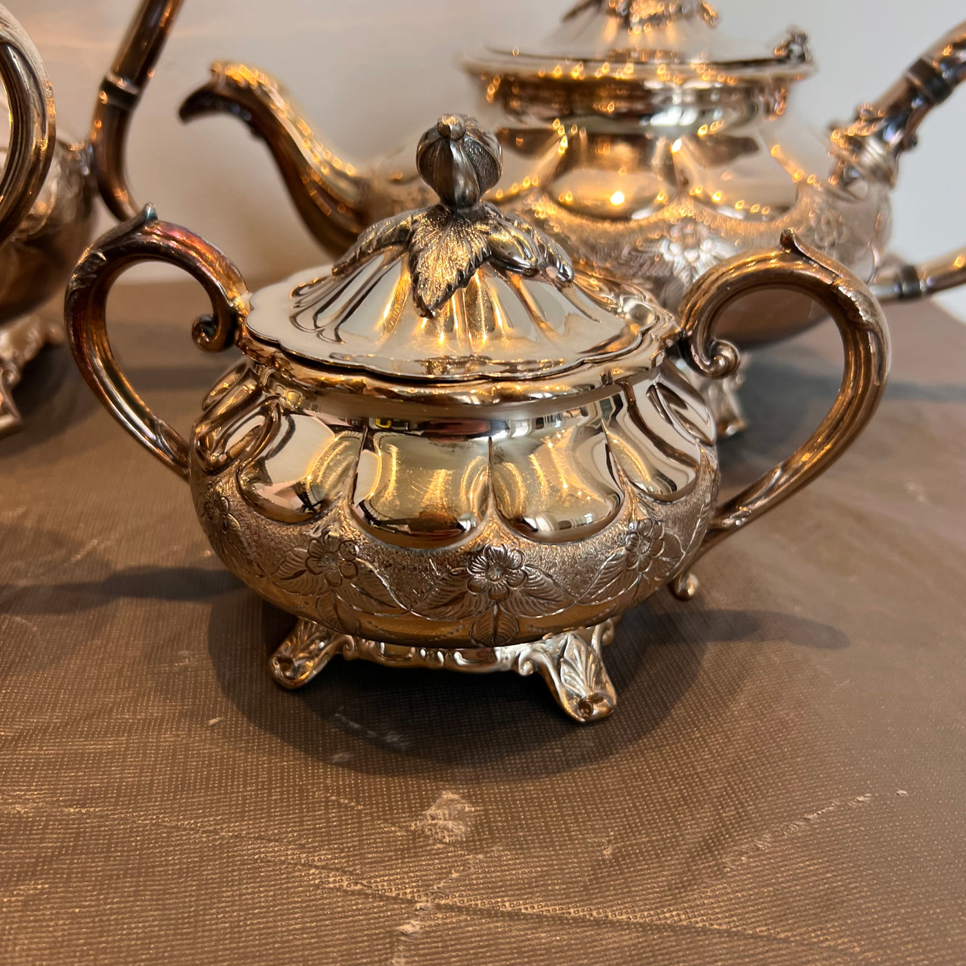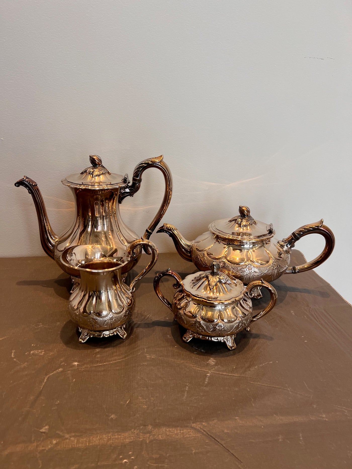 1881 Rogers Canada Silver Plated 4 pc Tea Set. Includes; tea pot, coffee pot, creamer & sugar.
