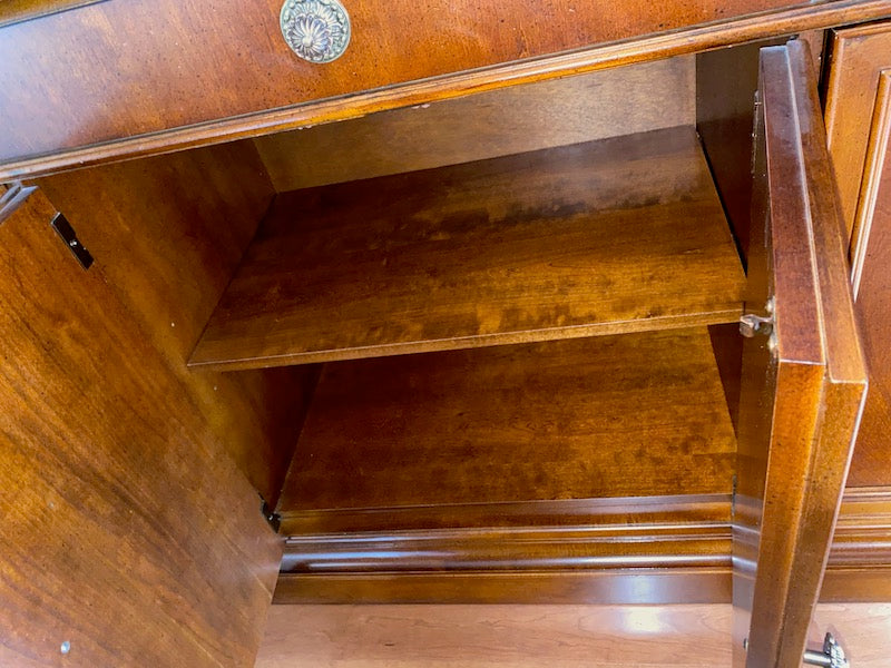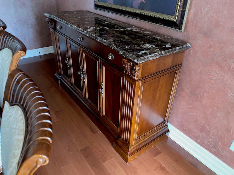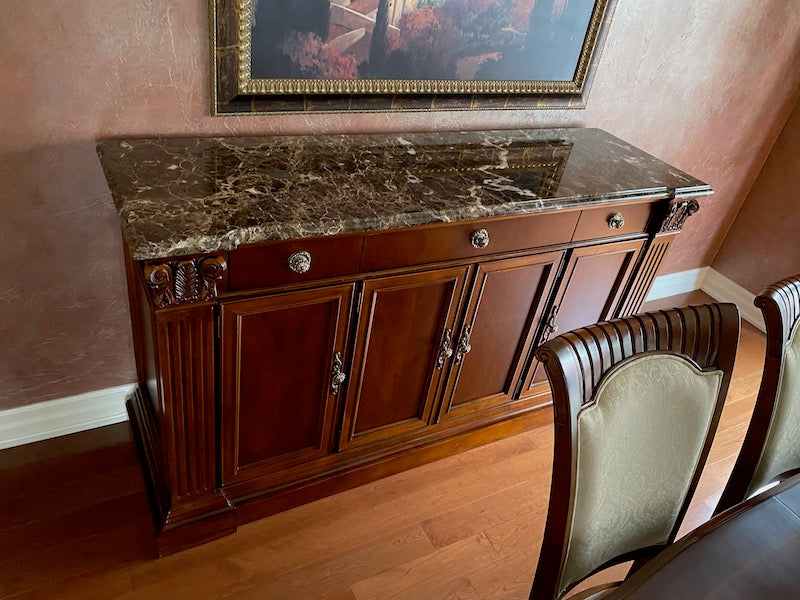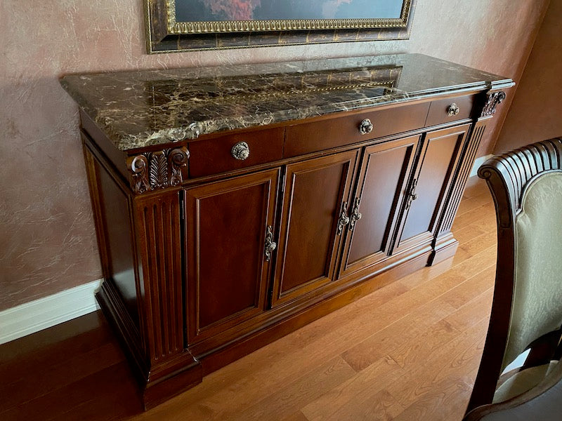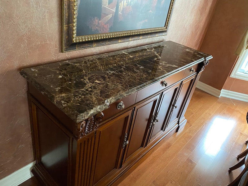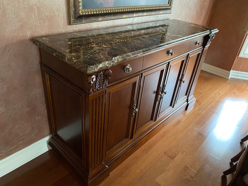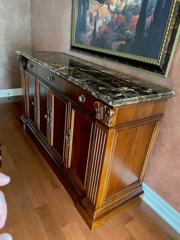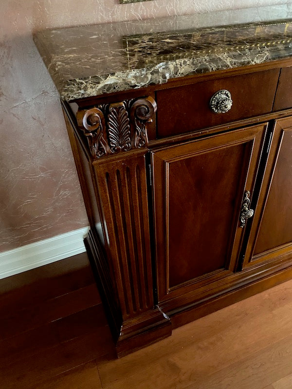 Marble top in excellent condition, with 3 drawers and cabinet space with shelving beneath.