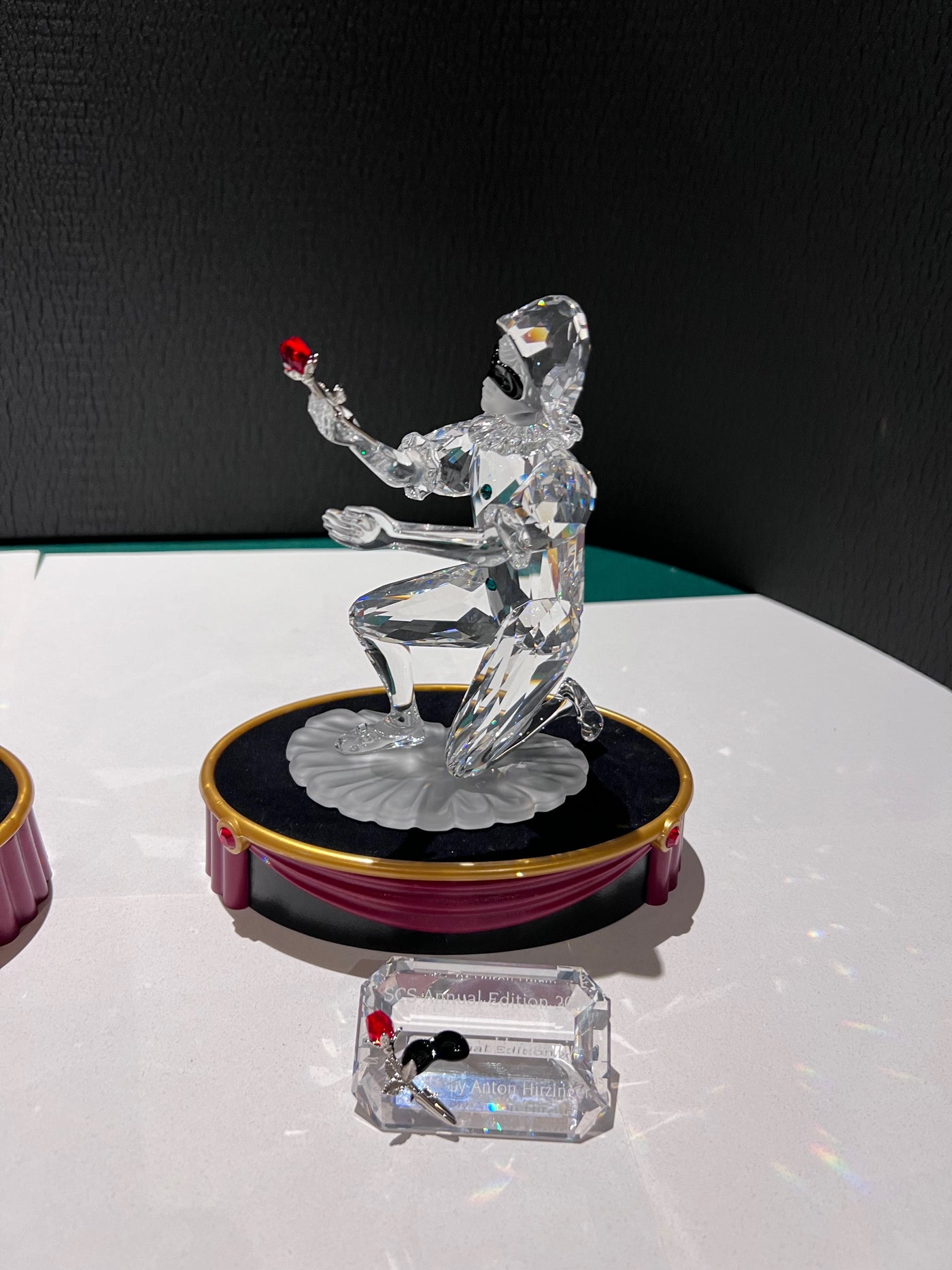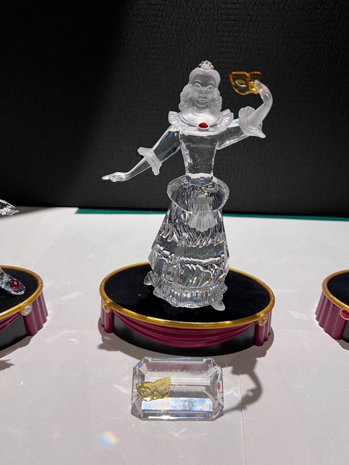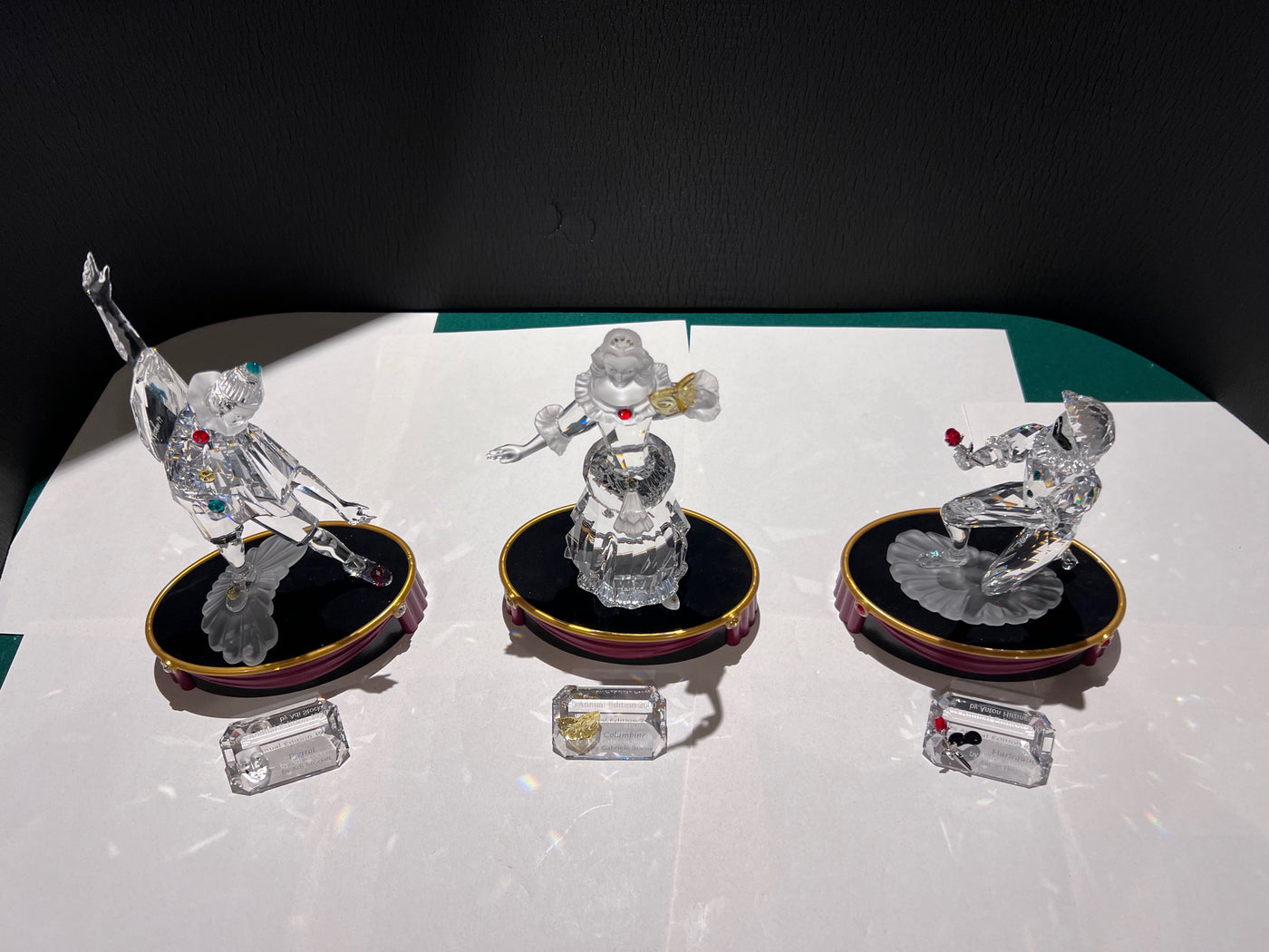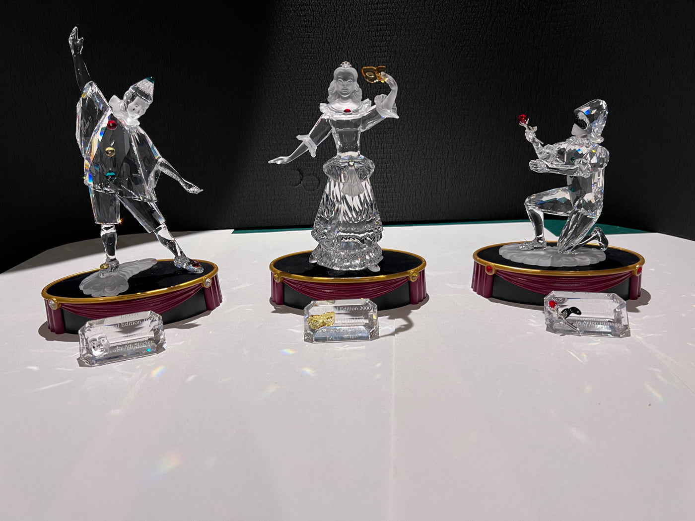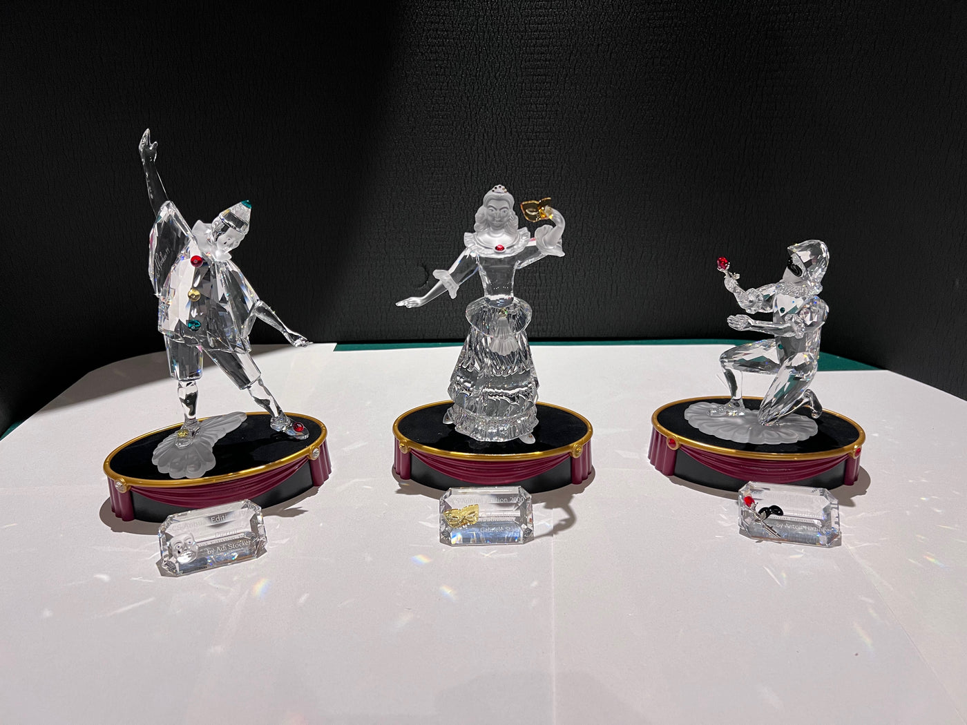 Swarovski Crystal ‘Masquerade’ Trilogy: Pierrot, Columbine and Harlequin, 1999-2001 (includes stands & plaques).