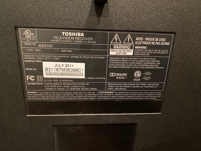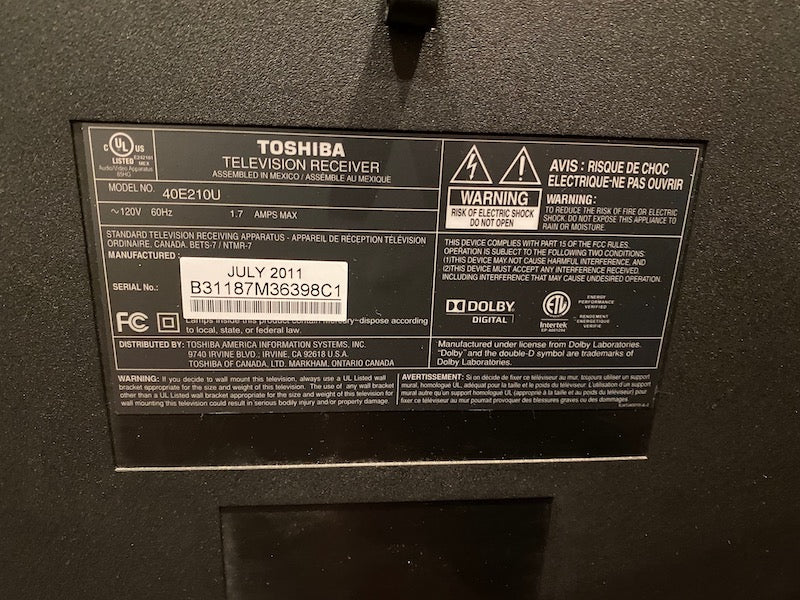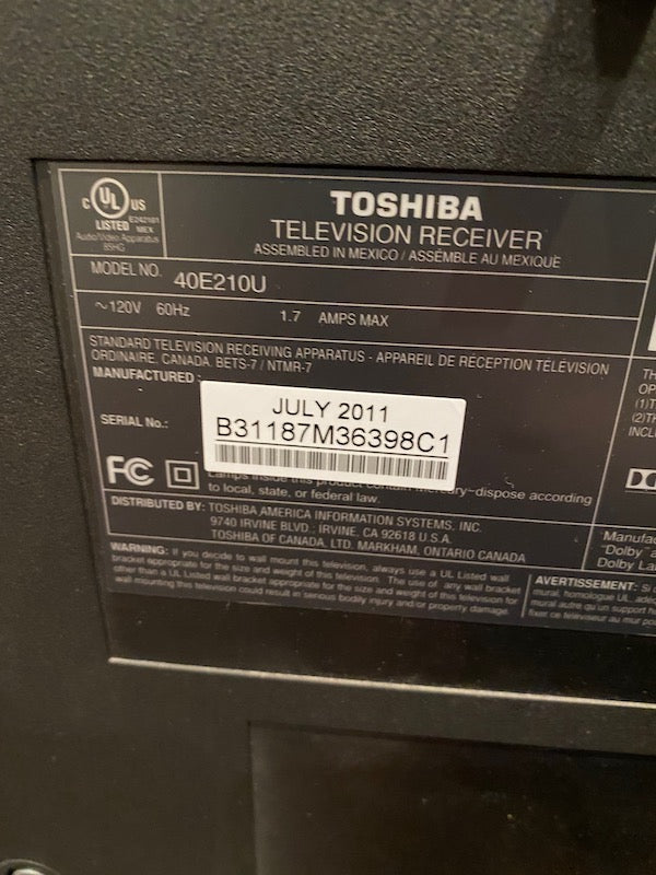 Toshiba 40E210U 40" LCD T.V. Manufactured in July 2011.