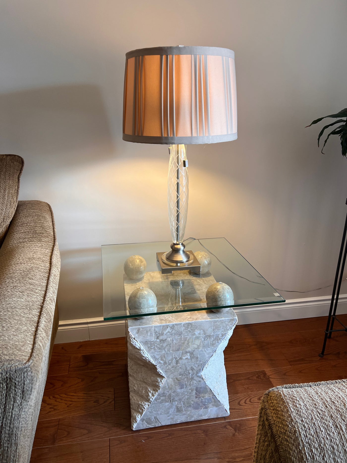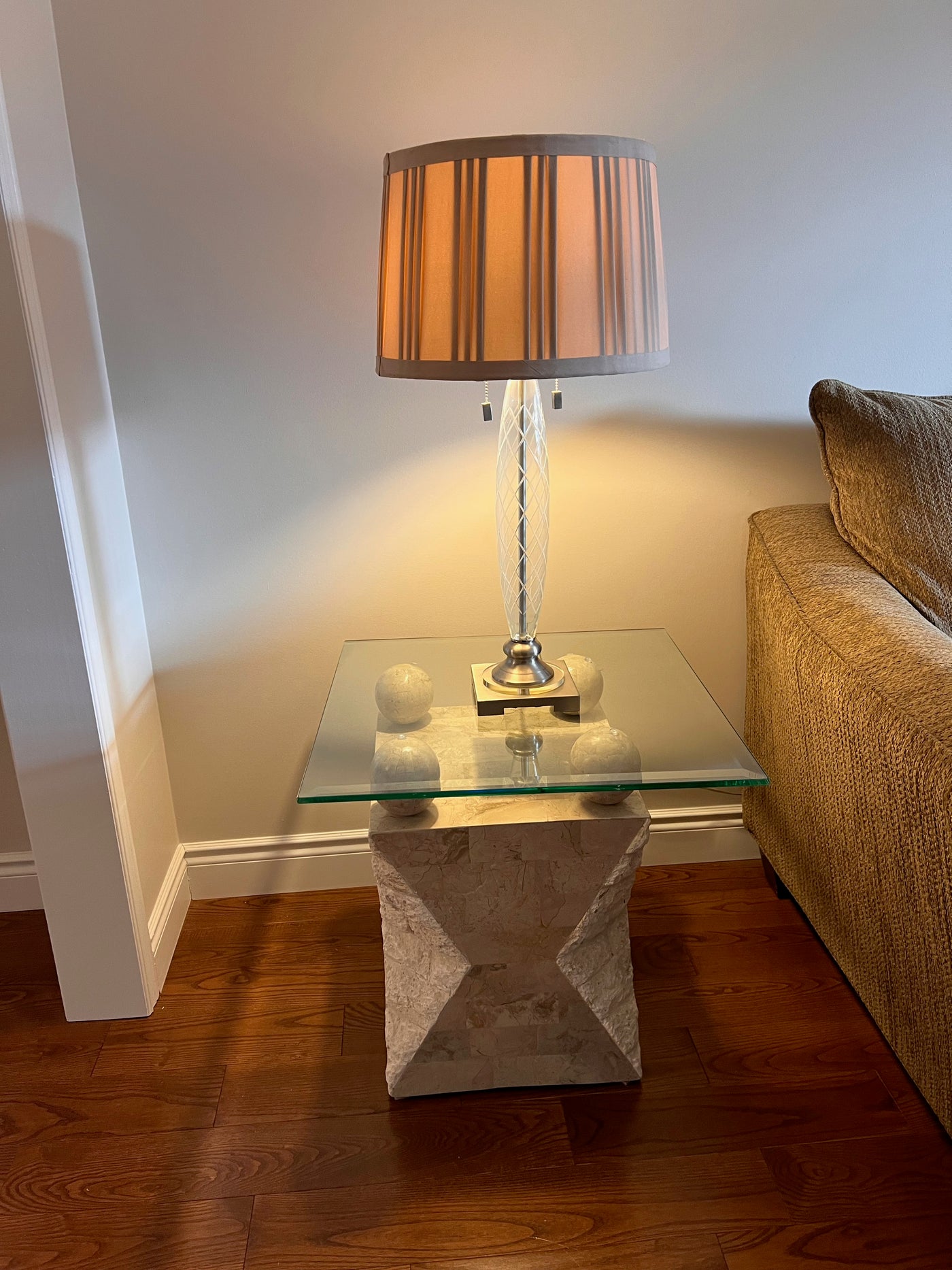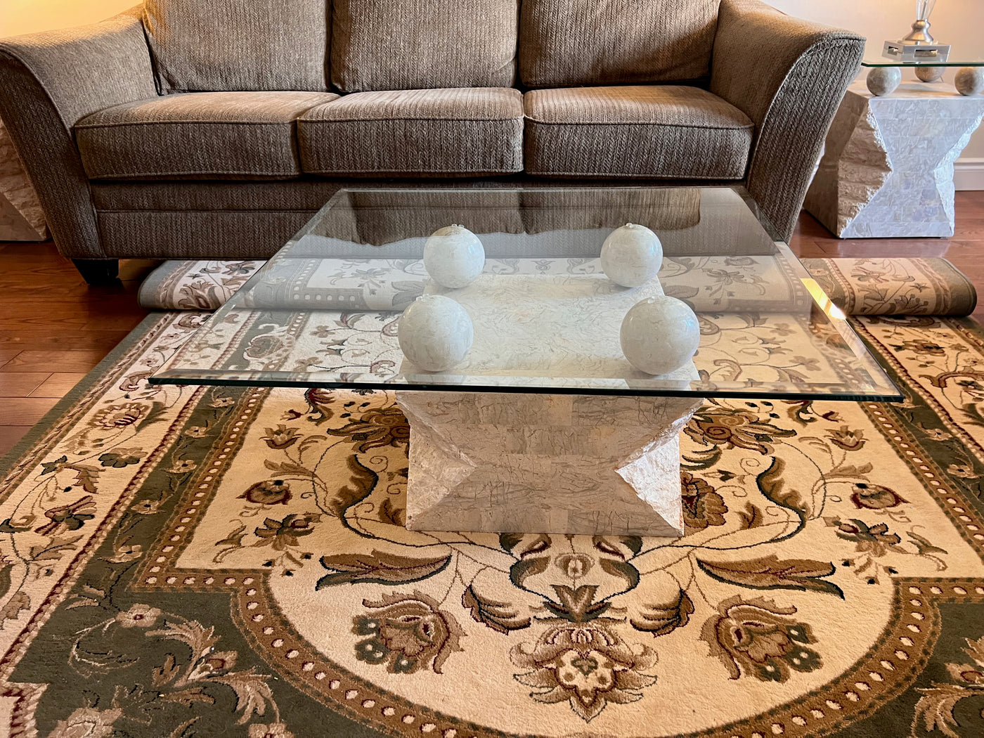 Postmodern Glass Top Tessellated Faux Stone Coffee Table + 2 Side Tables.
