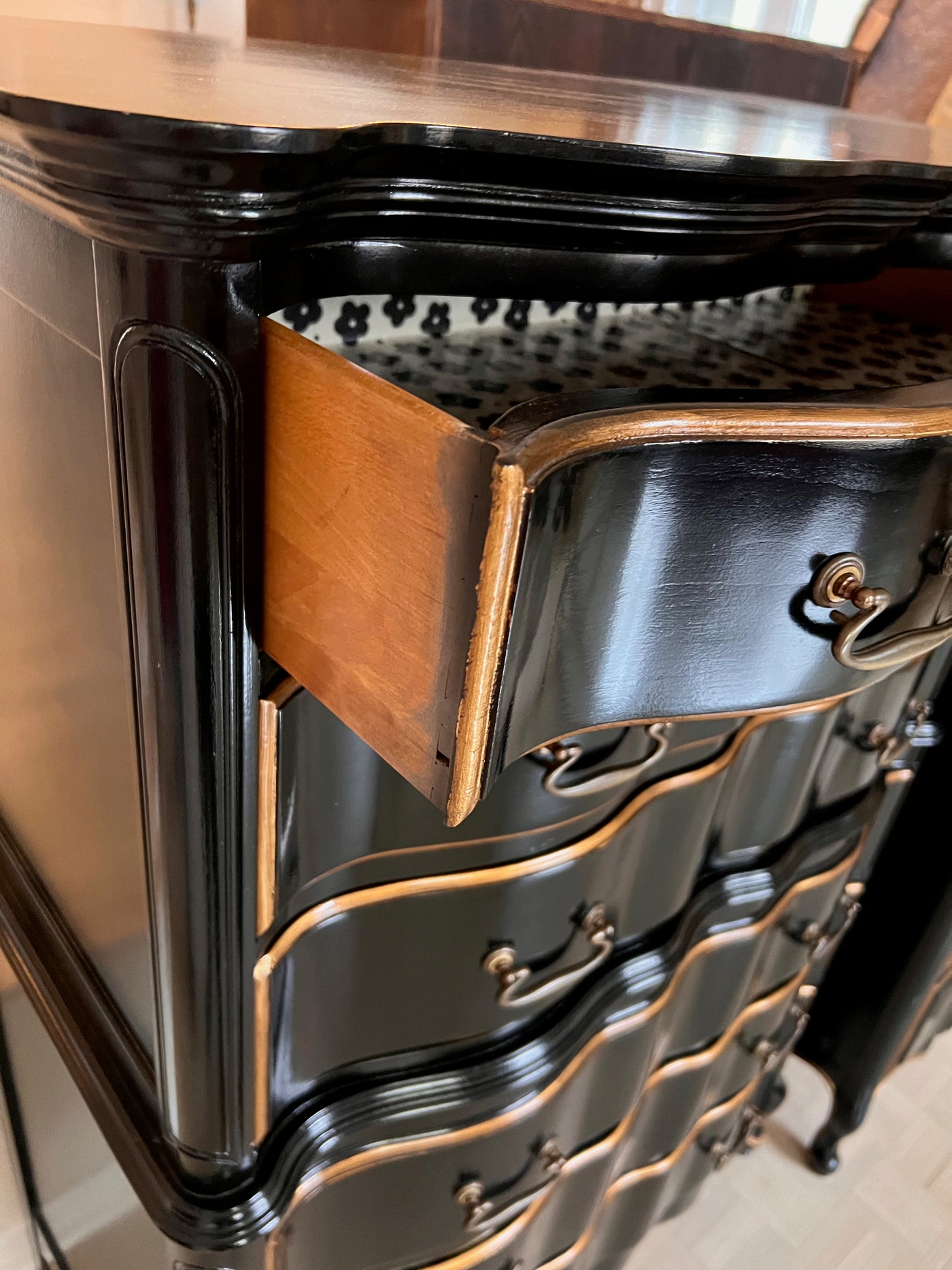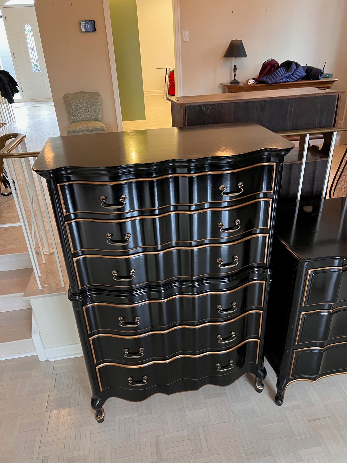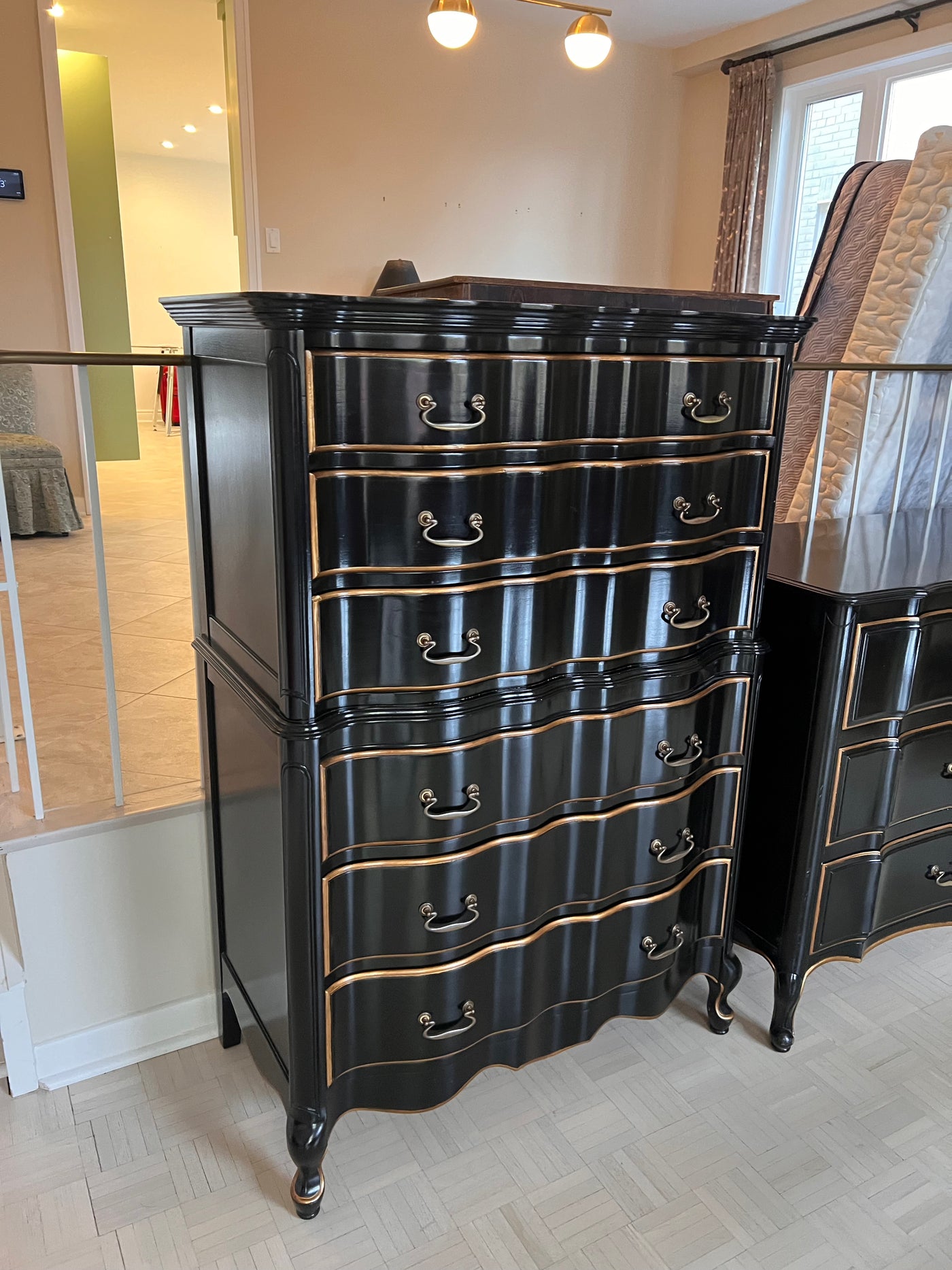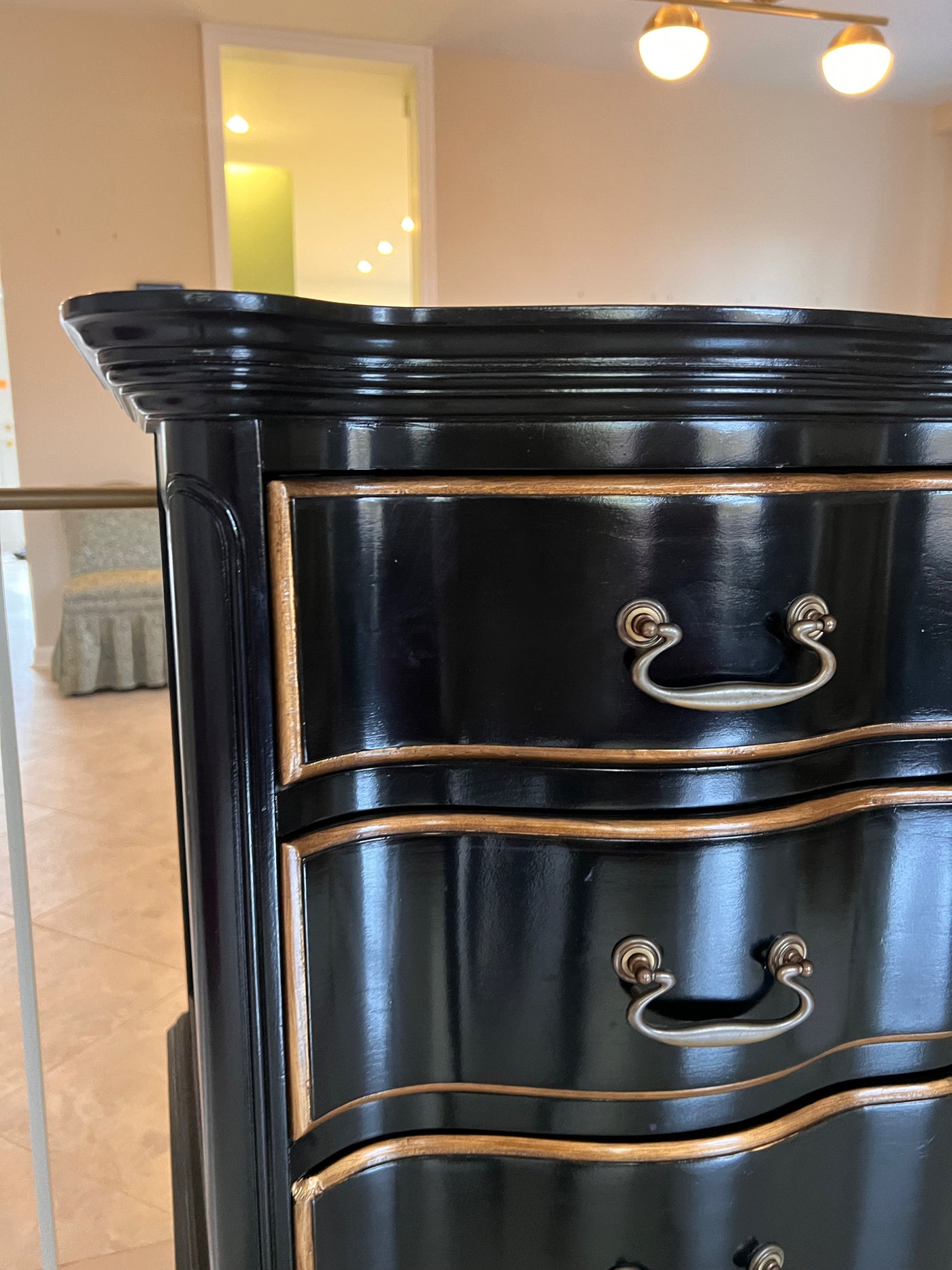 Vintage Black Re-Finished Highboy Dresser. In excellent condition.