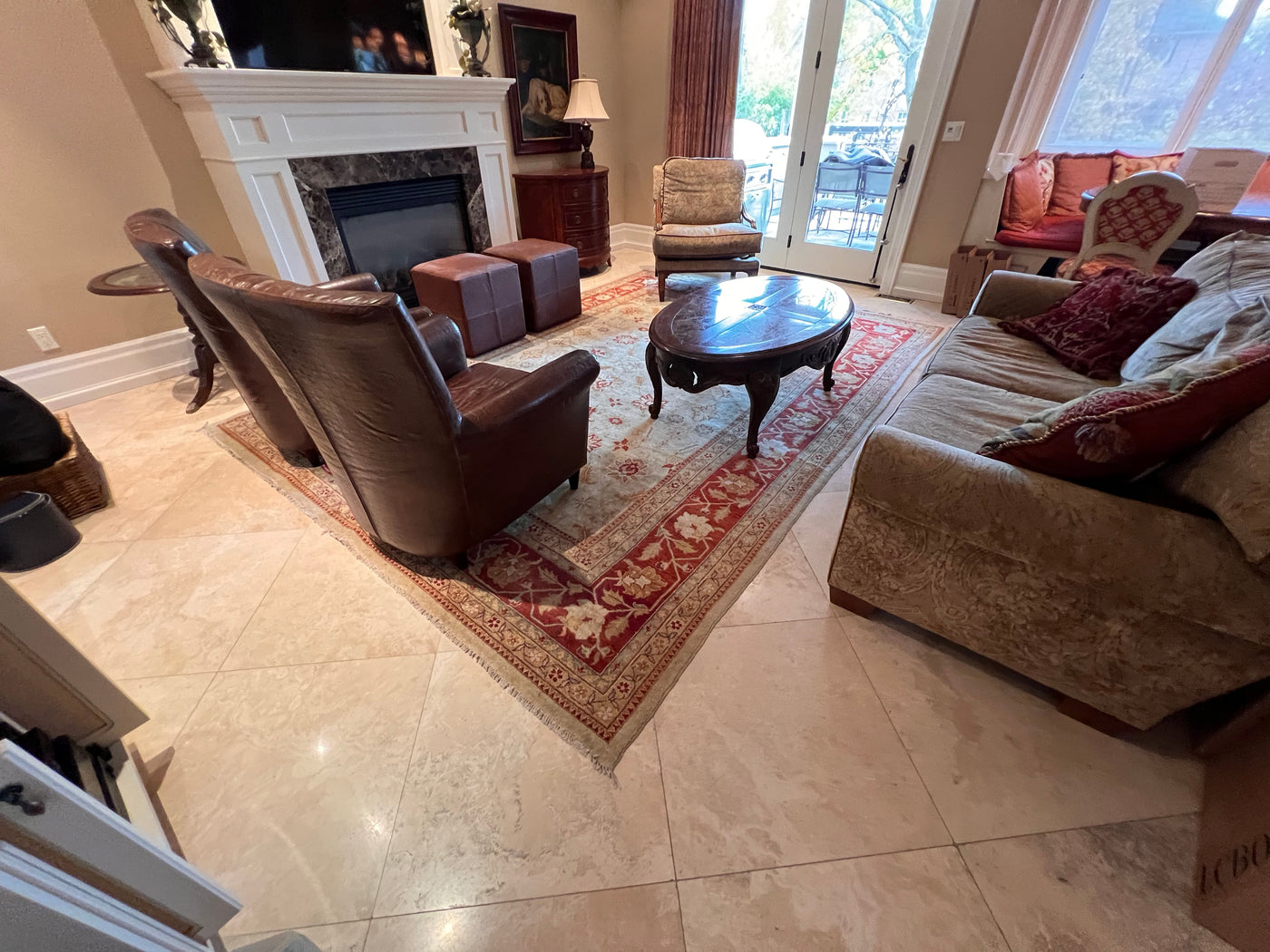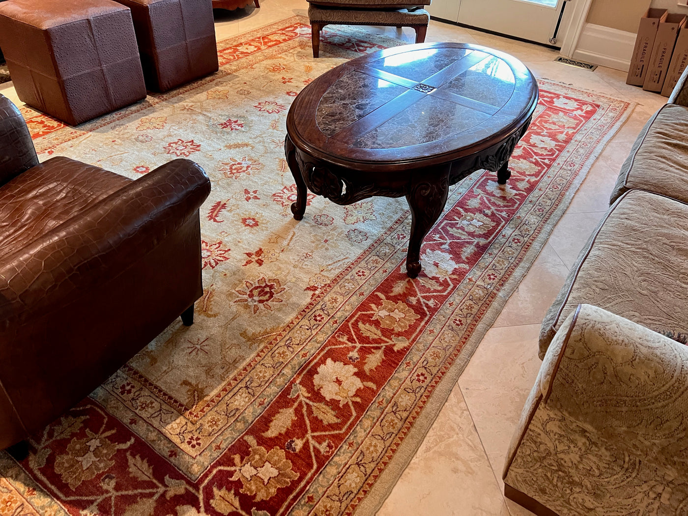 CONDITION: there are some dark spots on the border consistent with heavy traffic and frequent use. They’re not obvious 'stains' however a combination of foot traffic and sun has caused the rug to fade. SOLD AS IS! PLEASE VIEW ALL PICTURES.