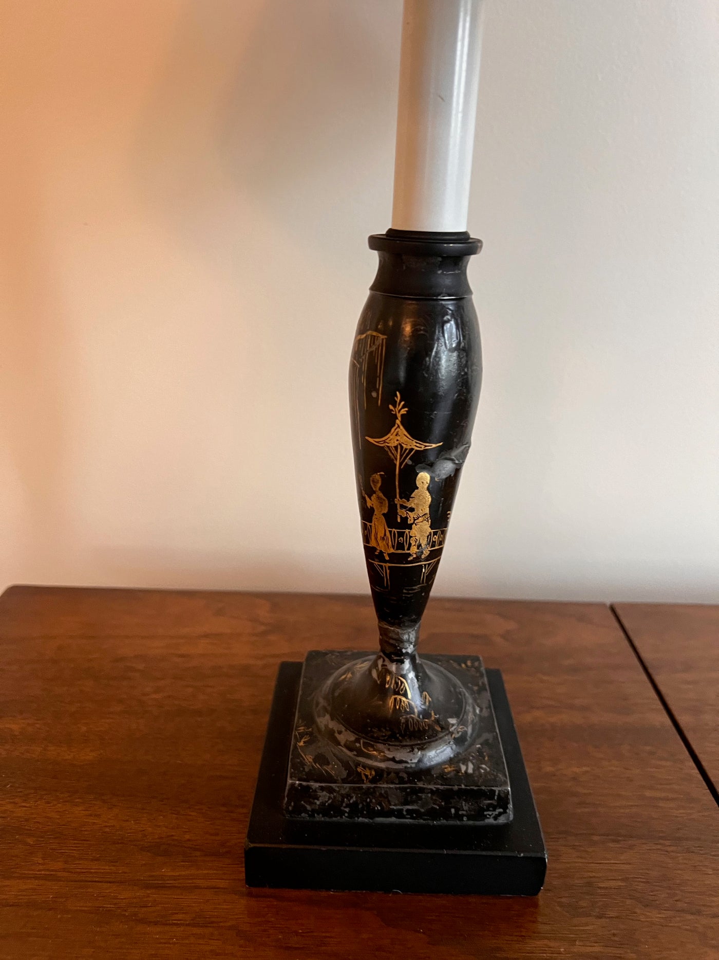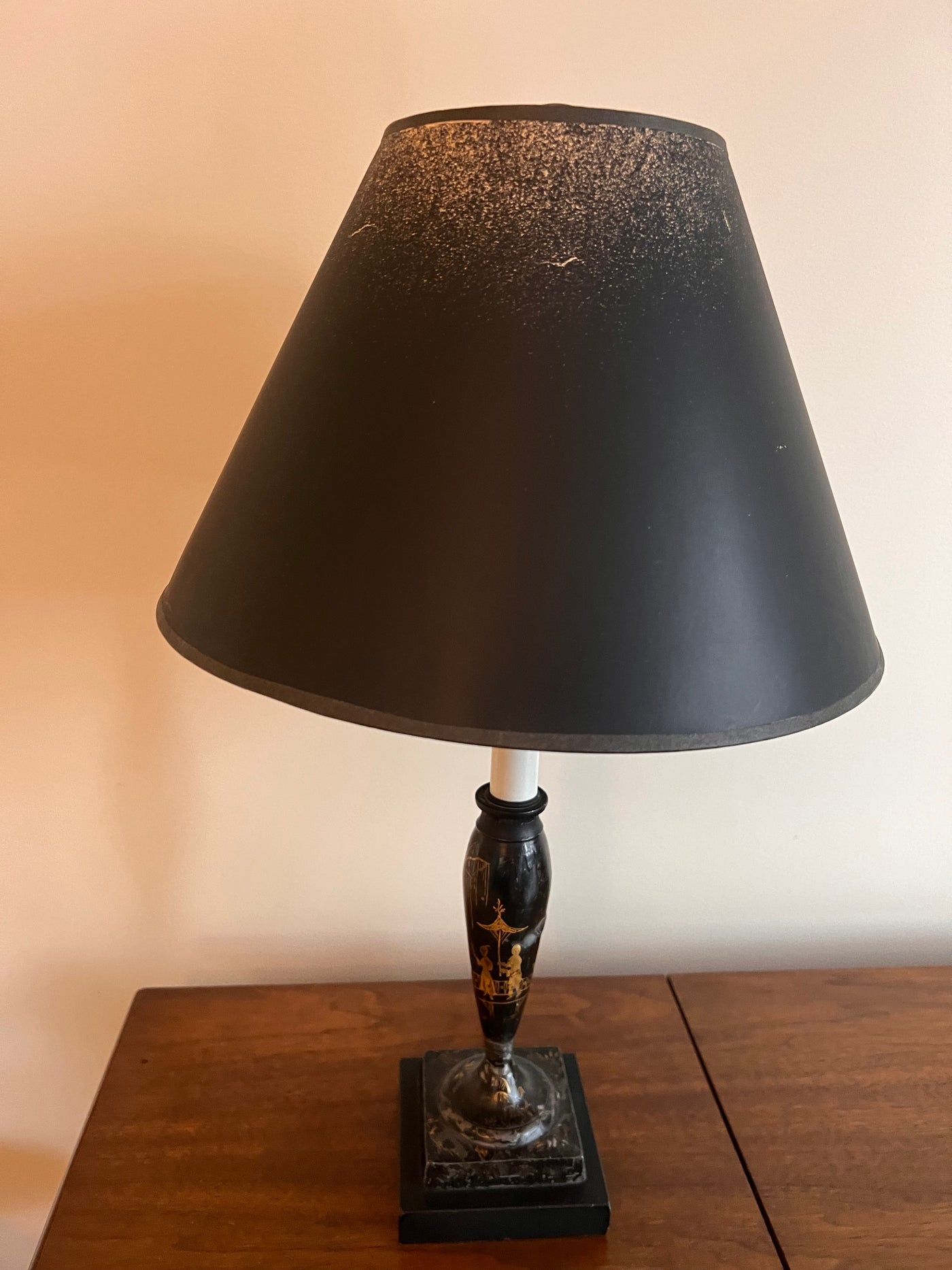 Small Japanese Table Lamp. Black shade with Japanese theme on the base.