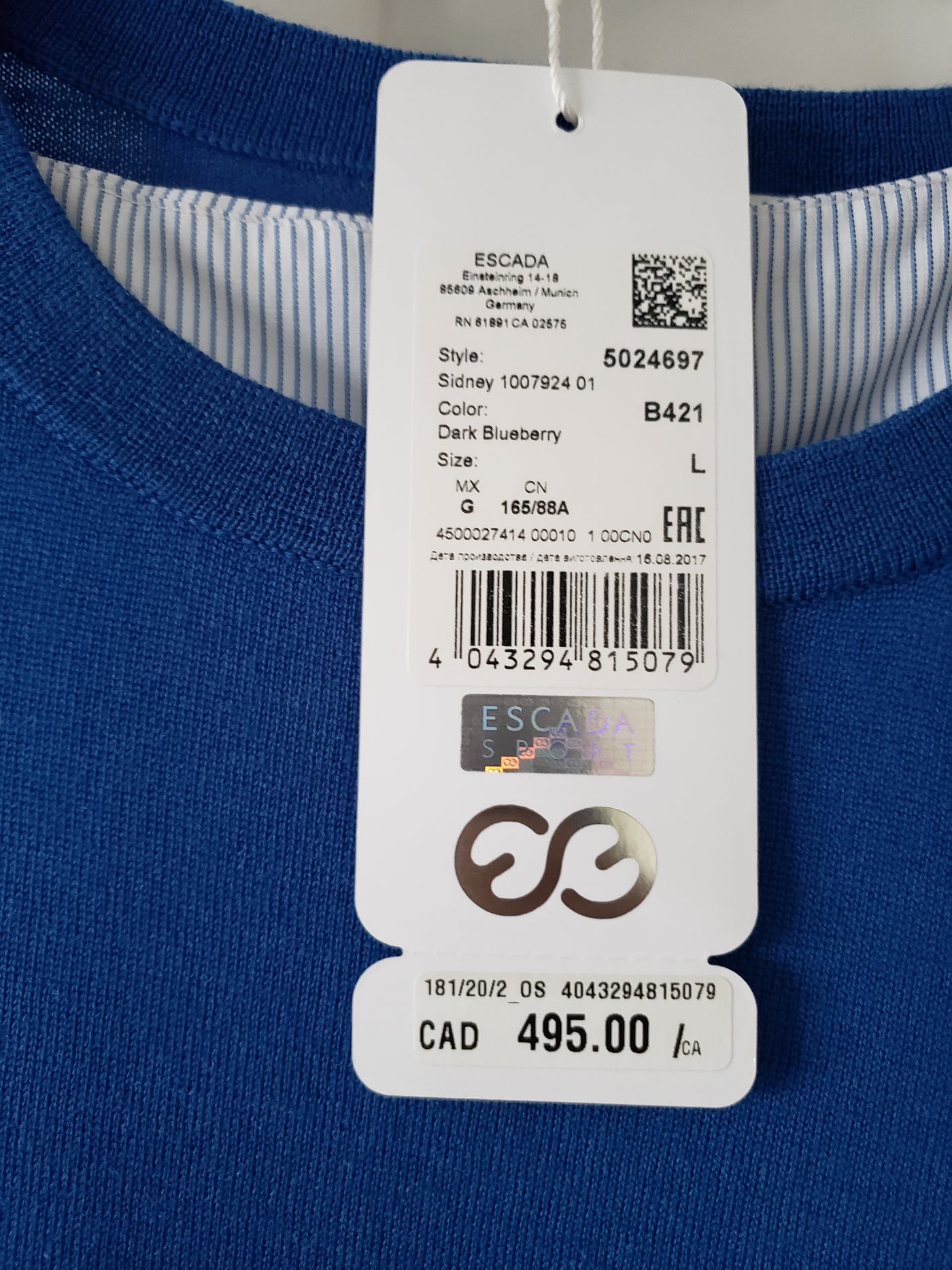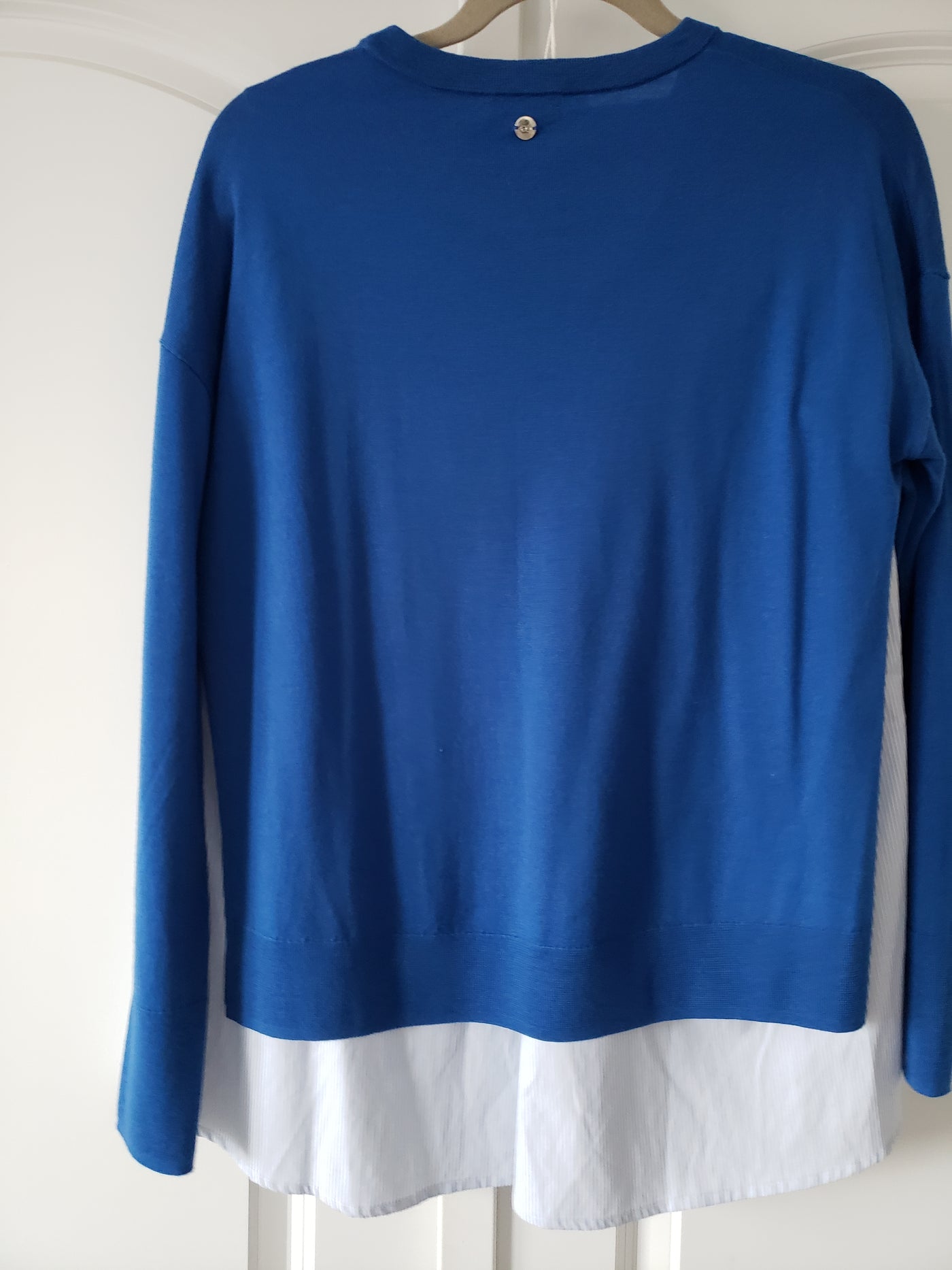 Women's Escada Blue Top w. Striped Lining. Brand new, modern top with white cotton pinstriped lining